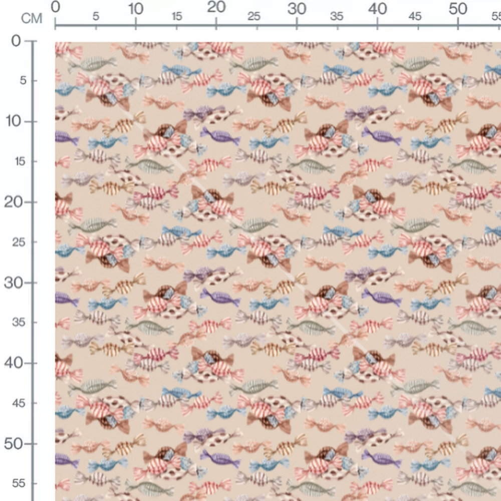 Les bonbons présentent des motifs de rayures et de pois variés. Chaque bonbon est enveloppé et affiche des couleurs pastel douces. Le fond beige met en valeur les motifs colorés des bonbons.Les tissus