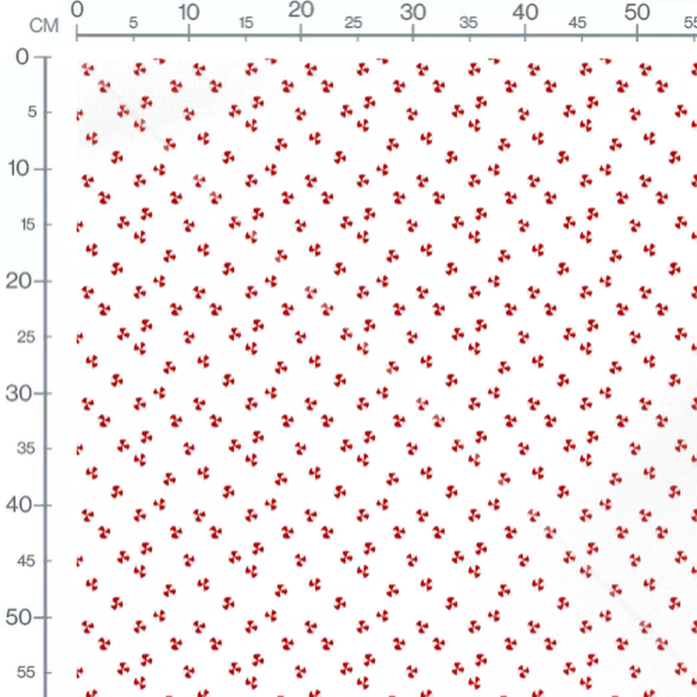 Les bonbons sont disposés de manière aléatoire sur le fond. Chaque bonbon a une forme circulaire avec une spirale rouge et blanche. Le fond blanc met en valeur les couleurs vives des bonbons.Les tissus