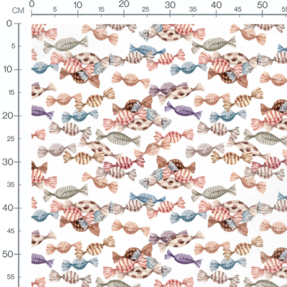 Les bonbons présentent des motifs de rayures et de pois dans des teintes variées. Les couleurs pastel dominent avec des nuances de rose, bleu, marron et beige. Chaque bonbon est enveloppé et dispose de motifs distincts.Les tissus