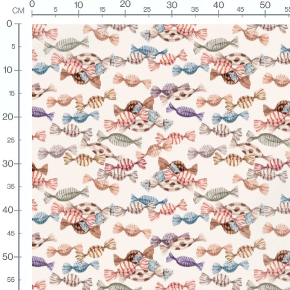 Les bonbons présentent des motifs de rayures et de pois dans des tons de bleu, rose, marron et vert. Chaque bonbon est enveloppé et dispose de motifs variés, ajoutant une touche ludique au design. Le fond crème met en valeur les couleurs vives des bonbons.Les tissus