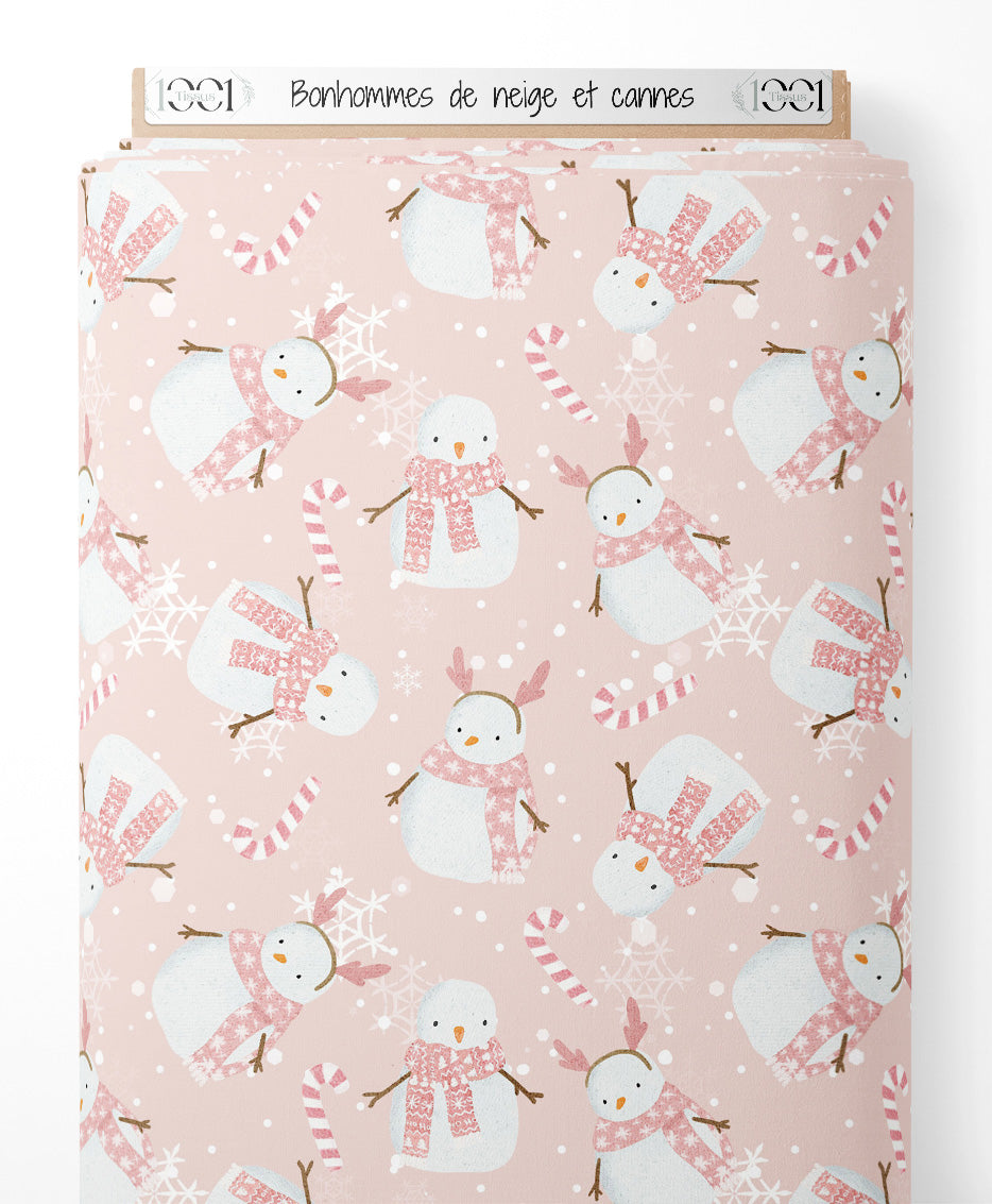 Les bonhommes de neige portent des écharpes et des bonnets roses. Des cannes en sucre rayées et des flocons de neige blancs complètent le motif festif.Les tissus