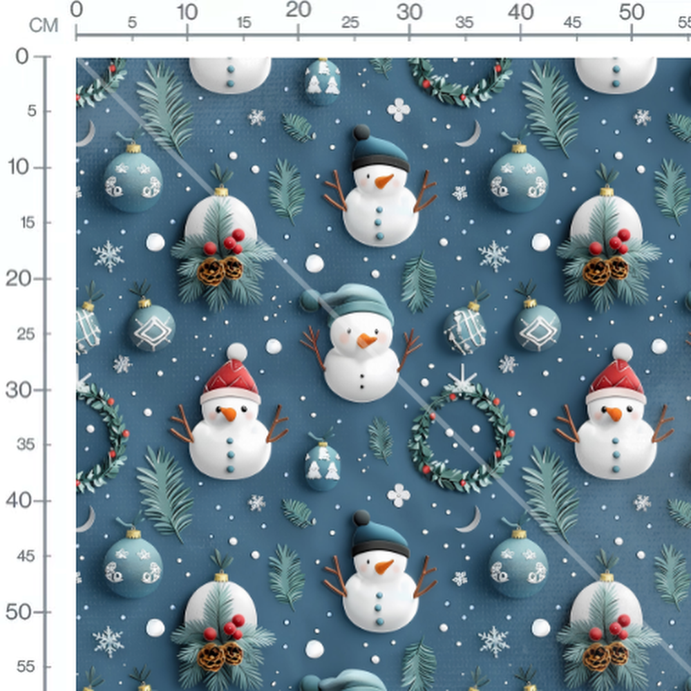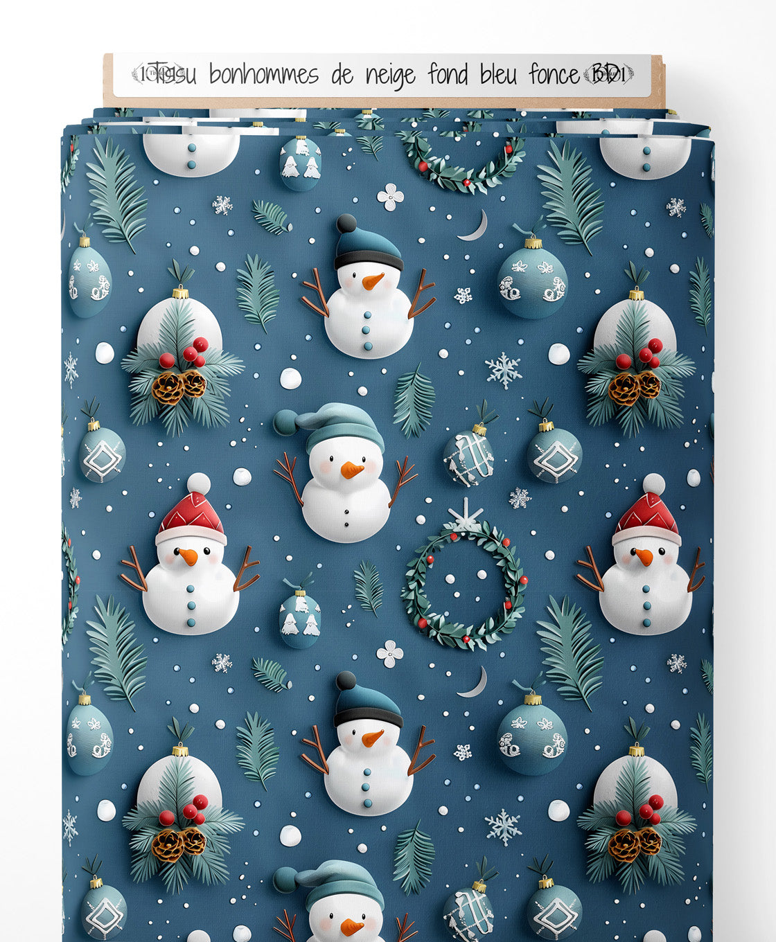 Tissu - bonhommes de neige fond bleu fonce 3D