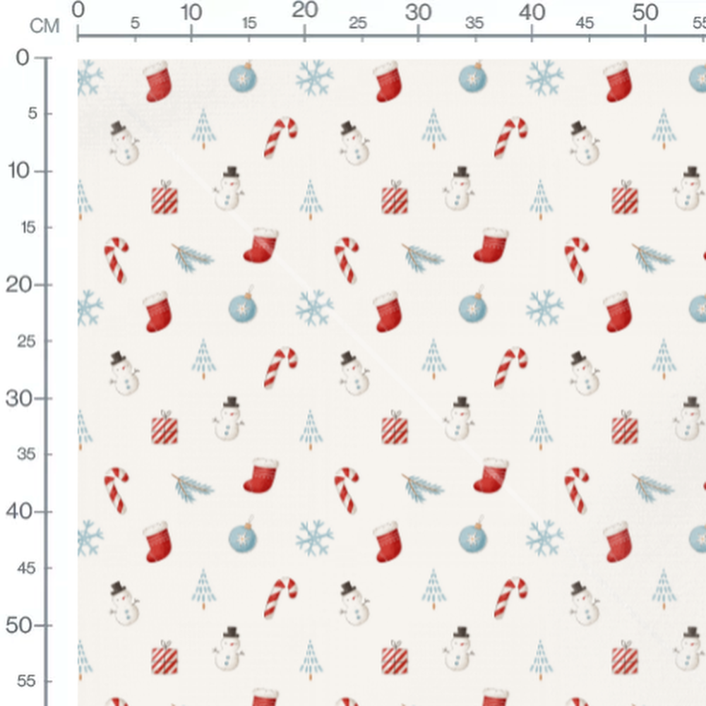 Les bonhommes de neige portent des chapeaux noirs. Les cadeaux sont emballés de rayures rouges et blanches. Les cannes de Noël sont rouges et blanches, ajoutant une touche festive. Les flocons de neige sont délicatement dessinés en bleu clair. Les sapins stylisés sont représentés en bleu avec une étoile orange au sommet.Les tissus