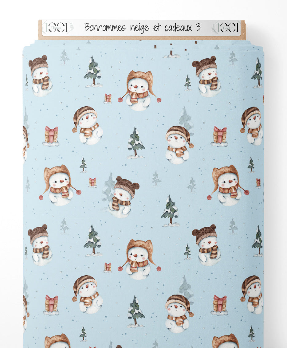 Les bonhommes de neige portent des écharpes rayées et des bonnets marron. Les sapins sont enneigés et les cadeaux sont ornés de rubans rouges.Les tissus