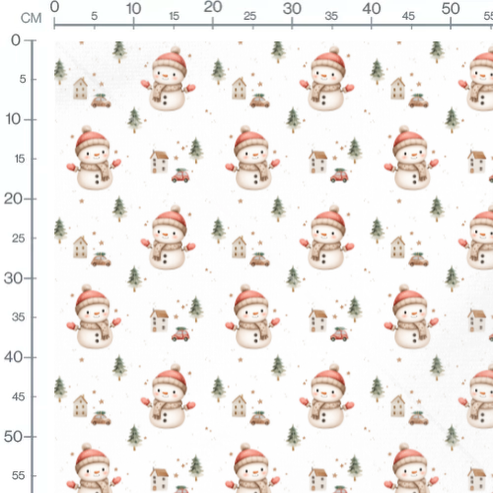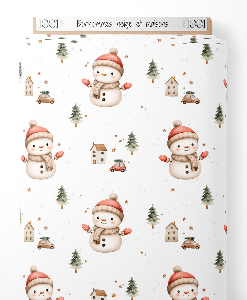 Des étoiles dorées parsèment le fond blanc. Les voitures rouges transportent des sapins sur le toit. Les maisons sont de couleur beige avec des toits marron.Les tissus