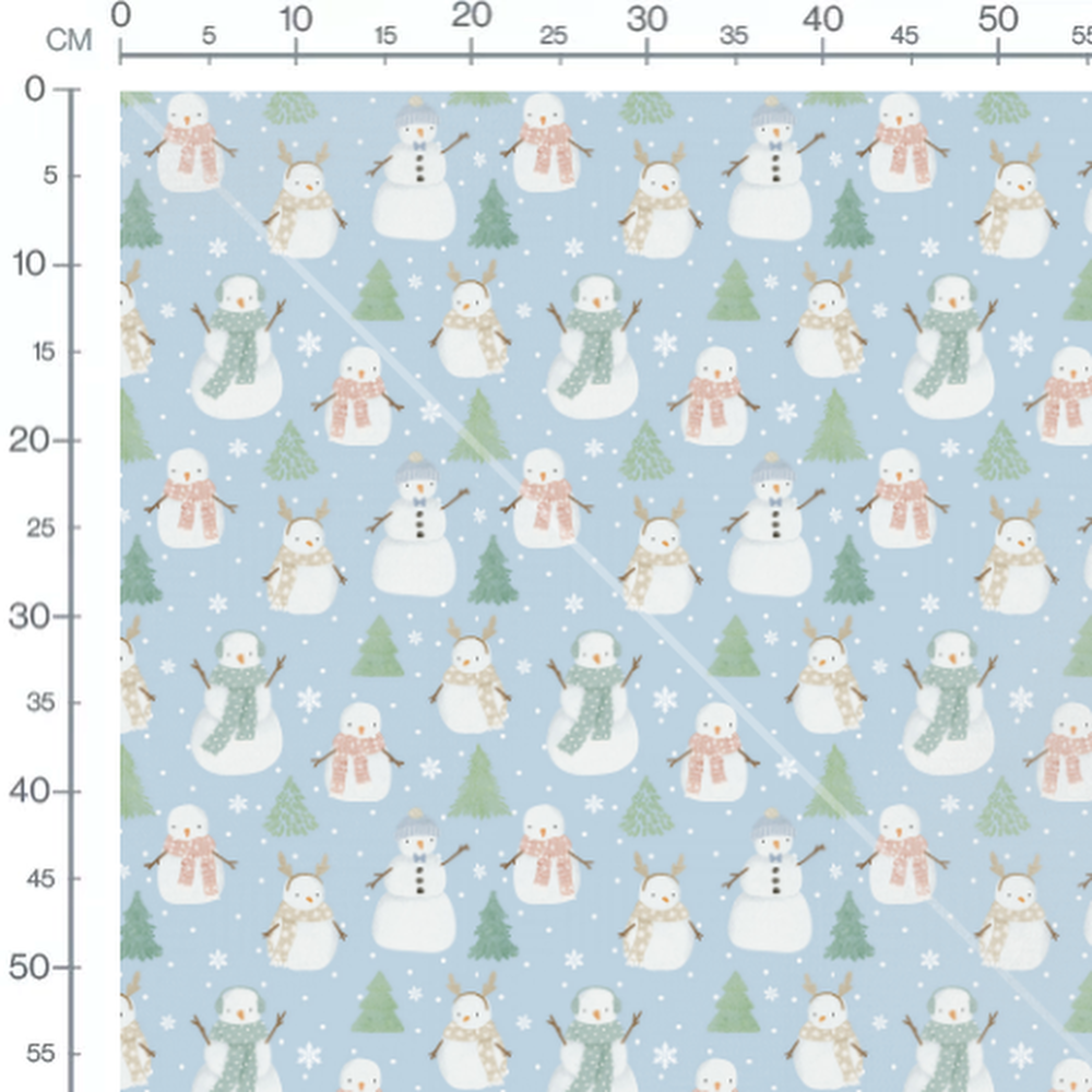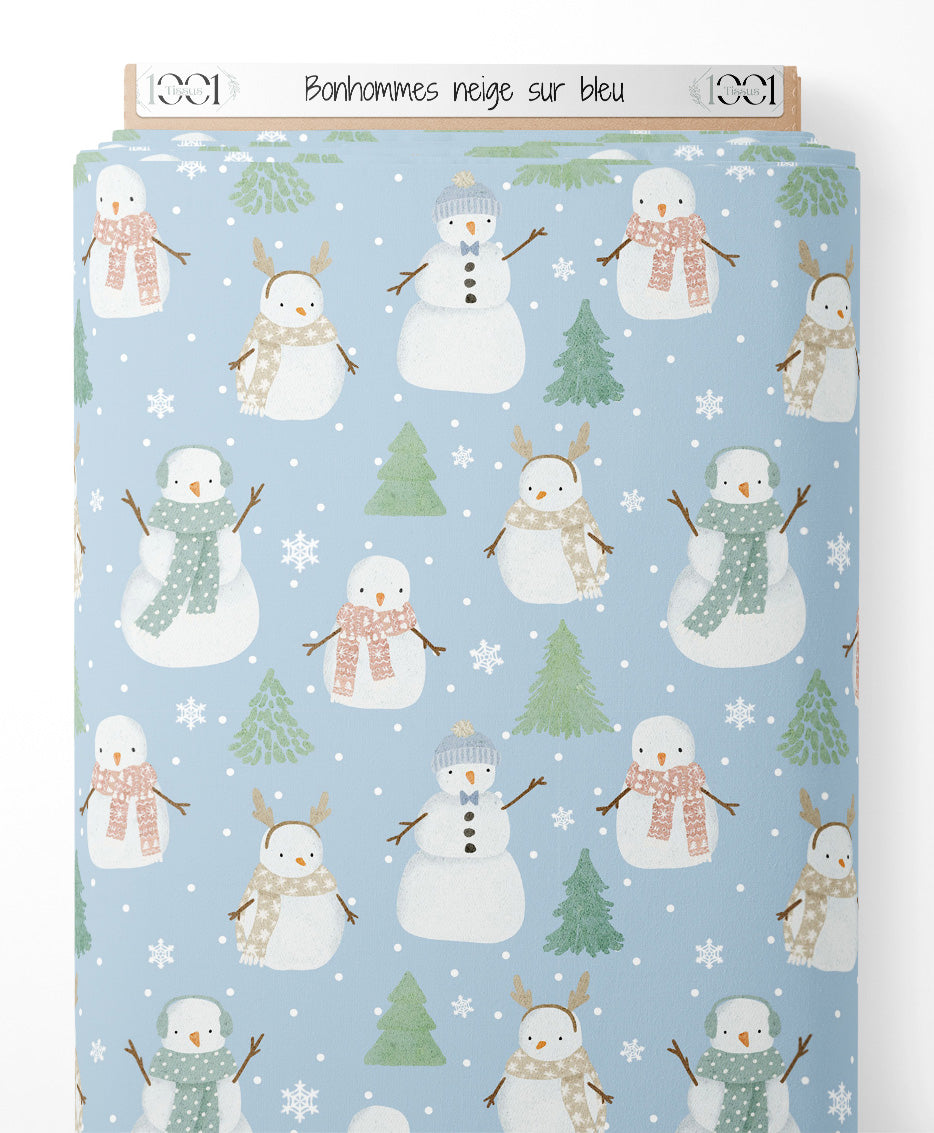 Certains bonhommes portent des accessoires comme des bonnets ou des bois de renne. Les écharpes sont de différentes couleurs, ajoutant de la variété au motif. Les sapins sont de différentes teintes de vert. Les flocons de neige sont uniformément répartis sur le fond bleu.Les tissus