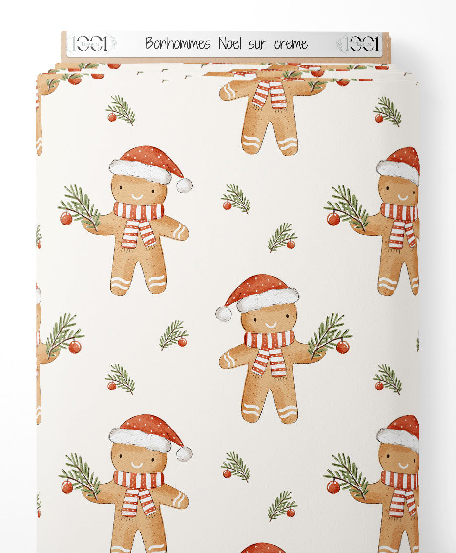 Les bonhommes portent des chapeaux de Noël rouges. Les écharpes sont rayées rouges et blanches. Les branches de sapin ajoutent une touche festive. Les baies rouges complètent le motif de Noël.Les tissus