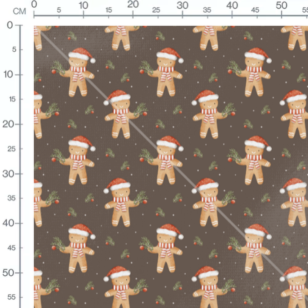 Les bonhommes portent des chapeaux de Noël rouges et blancs. De petites baies rouges décorent les branches de sapin. Le fond marron est parsemé de petits points blancs.Les tissus