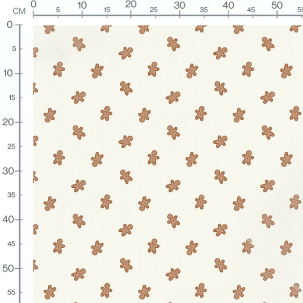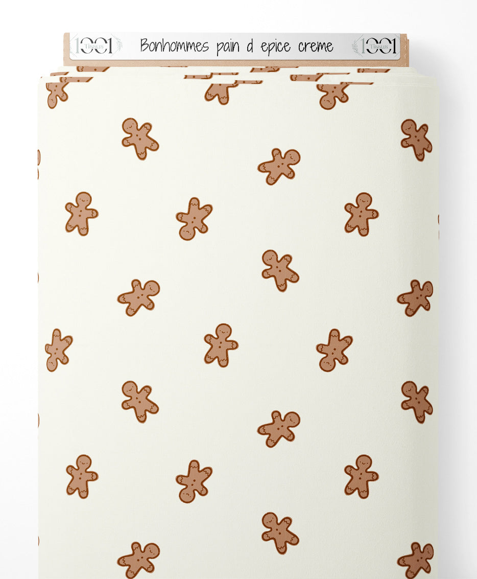 Les bonhommes pain d'épice sont répartis uniformément. Chaque bonhomme présente un sourire et des boutons décoratifs. Le fond crème met en valeur les motifs marron.Les tissus