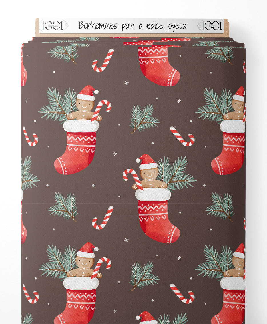 Les bonhommes pain d'épice portent des bonnets rouges et tiennent des cannes à sucre. Des branches de sapin vertes ajoutent une touche naturelle au motif. Le fond marron est parsemé de petites étoiles blanches.Les tissus