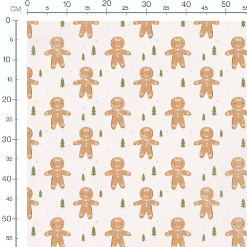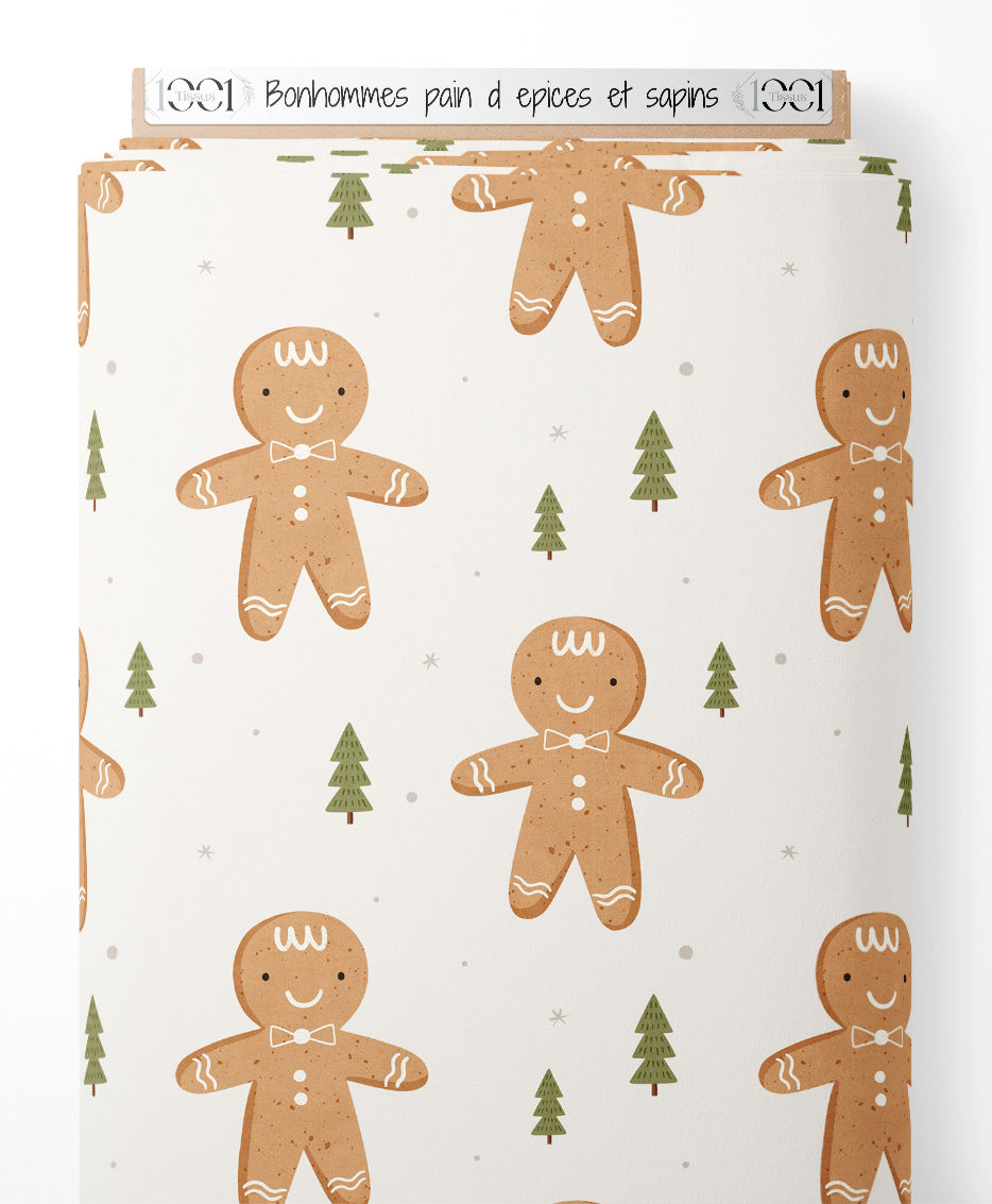 Les bonhommes pain d'épices sont décorés de détails blancs. De petits sapins verts ajoutent une touche festive au motif.Les tissus