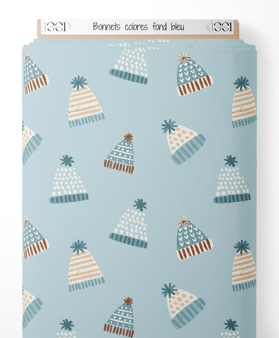Les bonnets présentent des motifs de rayures et de pois. Chaque bonnet est surmonté d'un pompon assorti.Les tissus