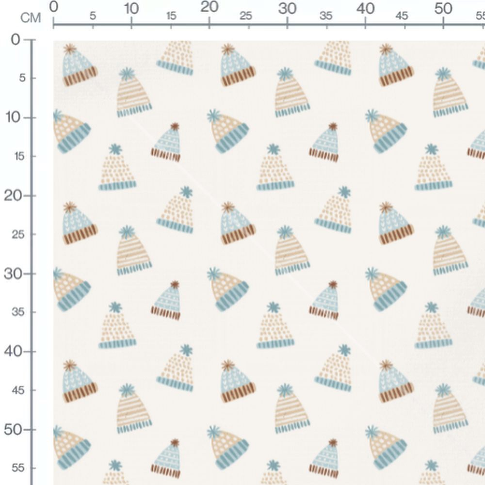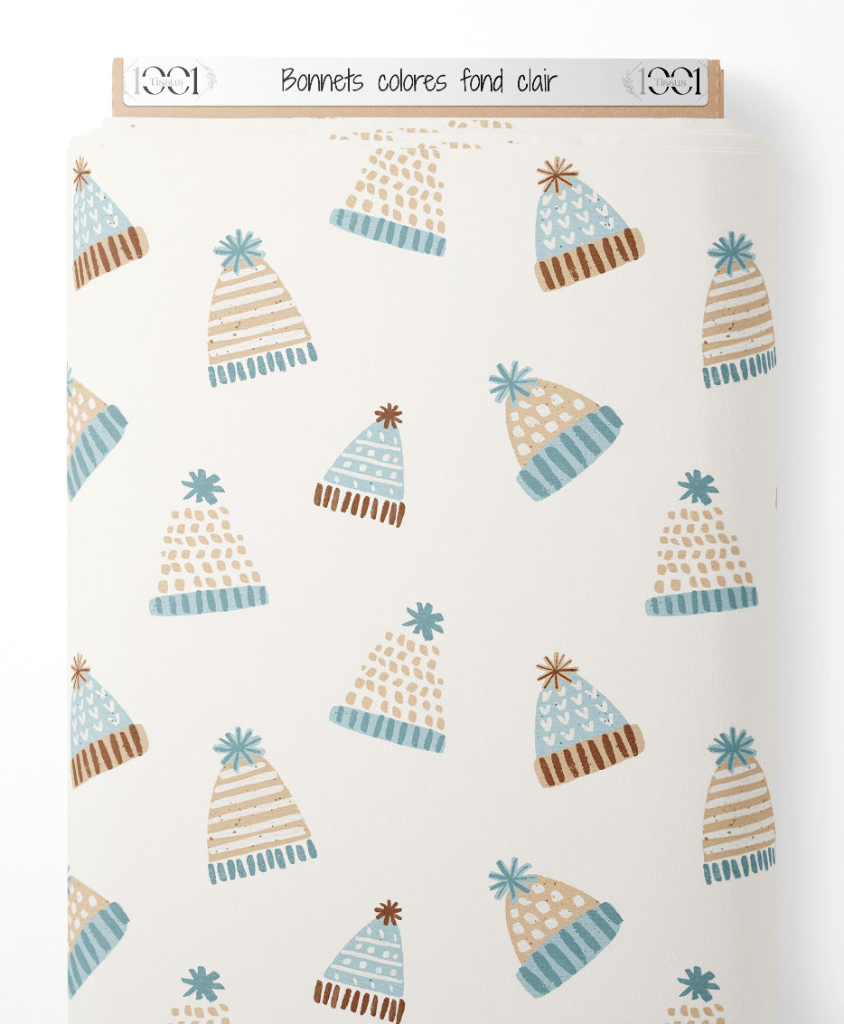 Les bonnets présentent des motifs variés incluant des rayures et des pois. Les couleurs principales sont le bleu, le beige et le marron. Chaque bonnet est surmonté d'un pompon assorti.Les tissus