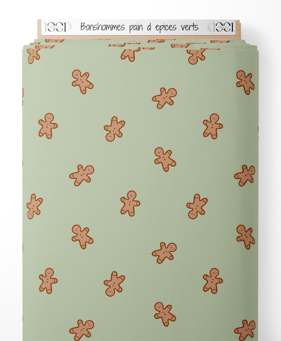 Les bonshommes en pain d'épices sont répartis uniformément sur le fond. Chaque figure présente des traits simples et des décorations minimalistes.Les tissus