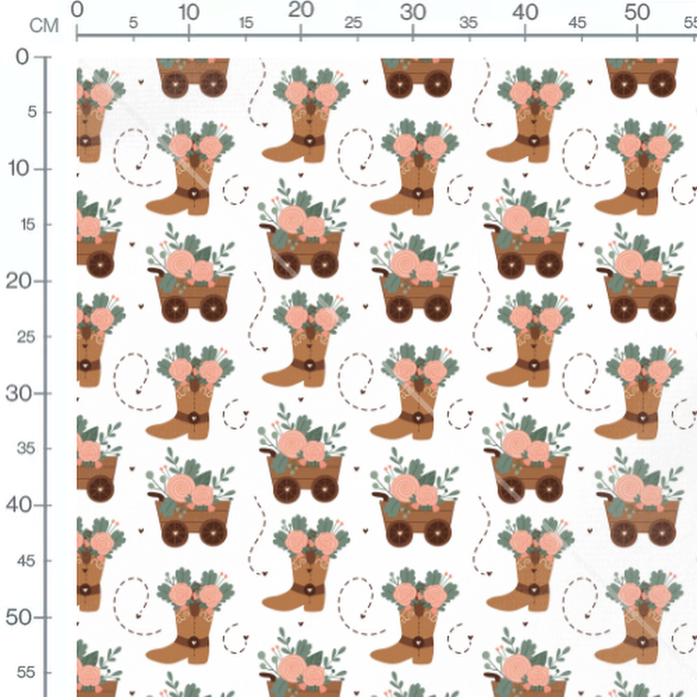 Les bottes marron contiennent des fleurs roses et des feuillages verts. Des petits cœurs et des lignes pointillées ajoutent des détails ludiques au motif.Les tissus