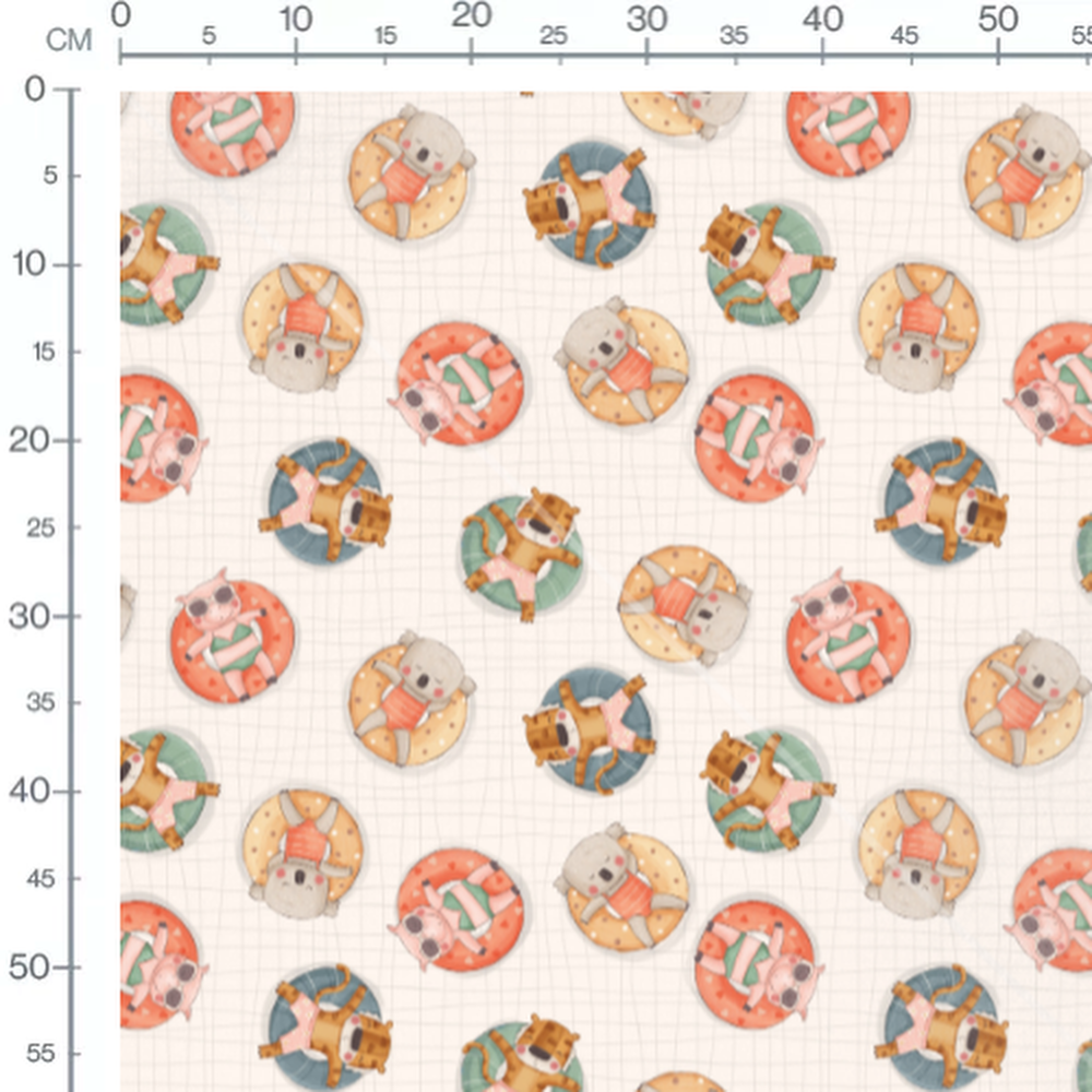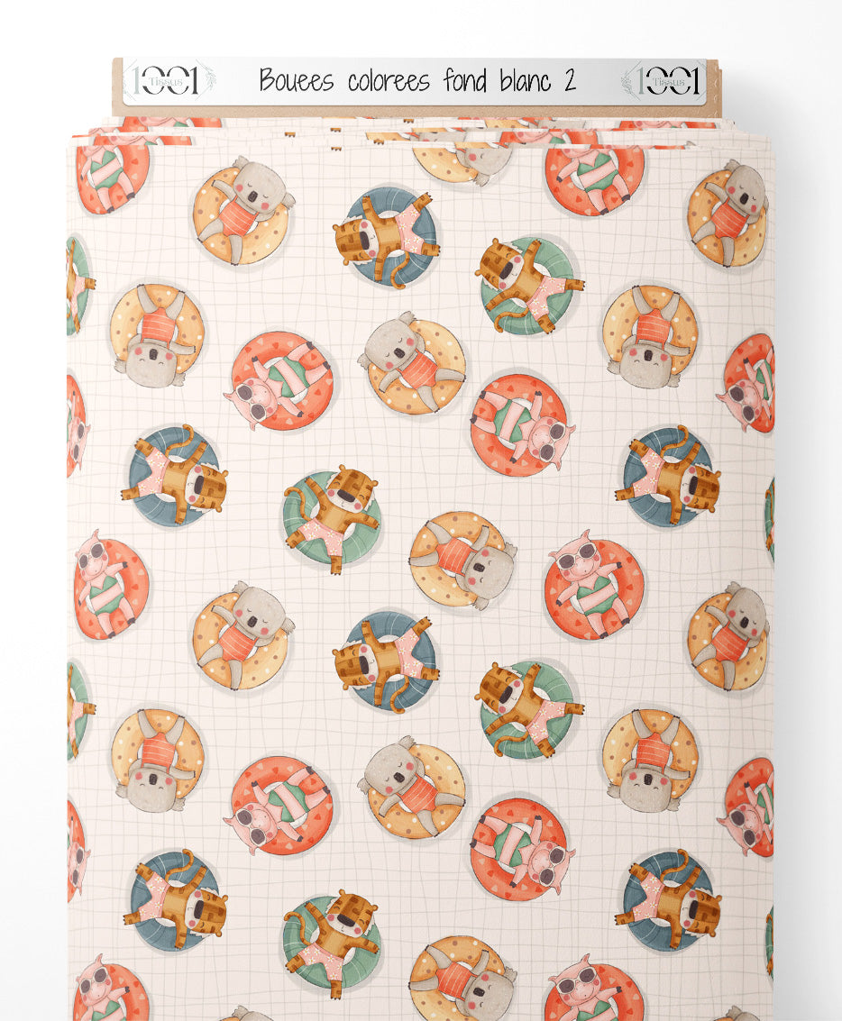 Les animaux portent des maillots rayés et lunettes de soleil. Les bouées sont décorées de motifs simples et colorés. Le fond quadrillé ajoute une touche graphique discrète.Les tissus