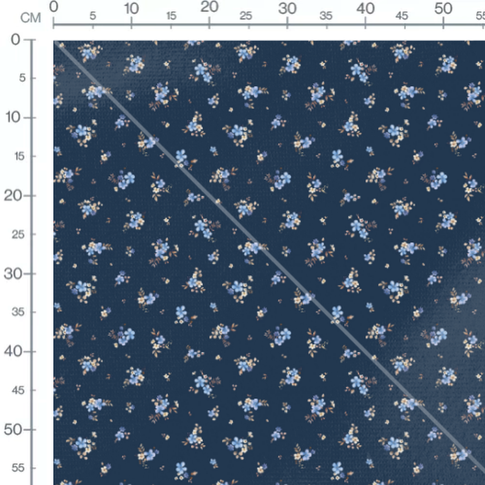 Les fleurs sont de différentes tailles et nuances de bleu. Les feuilles ajoutent une touche de beige et de vert au motif.Les tissus