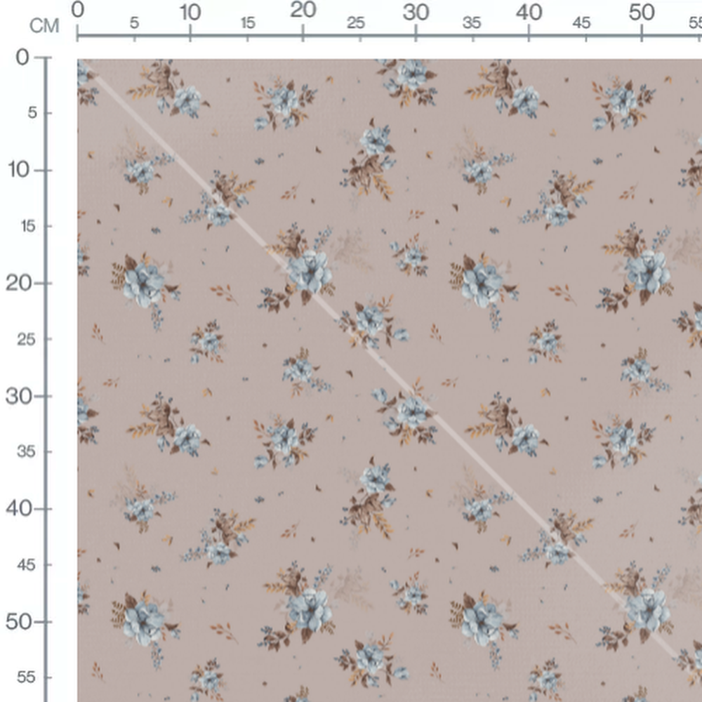 Les fleurs sont entourées de petites feuilles marron et bleues. Quelques petites fleurs bleues ajoutent de la diversité au motif.Les tissus