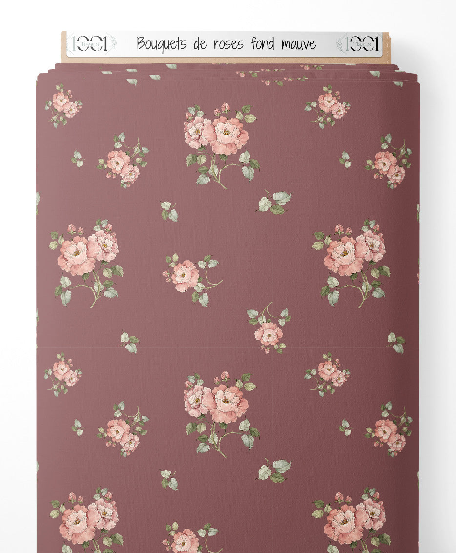 Les roses sont détaillées avec des nuances de rose et de vert. Les feuilles sont finement dessinées, ajoutant une touche de réalisme. Le fond mauve met en valeur les couleurs des fleurs.Les tissus