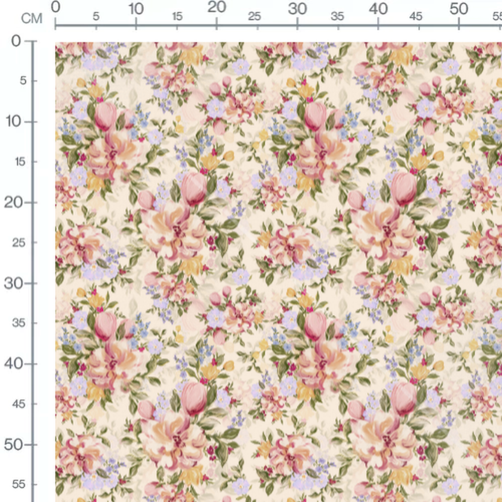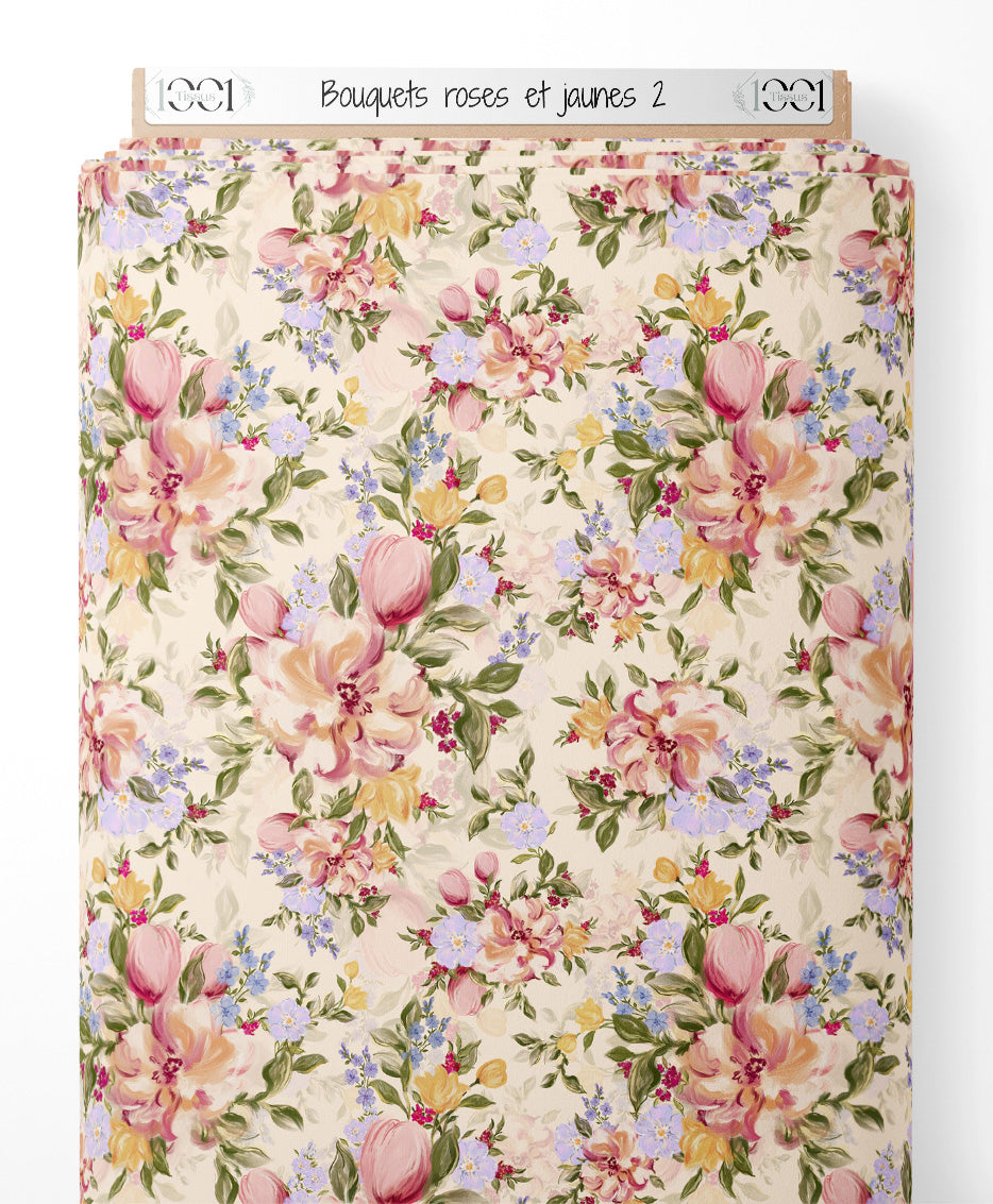 Les fleurs roses sont accompagnées de petites fleurs violettes et jaunes. Les feuilles vertes ajoutent une touche de fraîcheur au motif. Le fond beige met en valeur les couleurs douces des fleurs.Les tissus