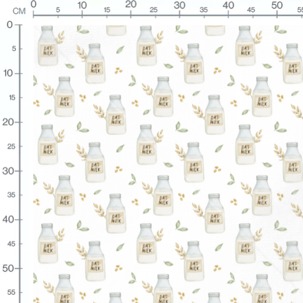 Les bouteilles de lait d'avoine sont accompagnées de petits épis dorés. Des feuilles vertes et quelques grains d'avoine complètent le motif.Les tissus