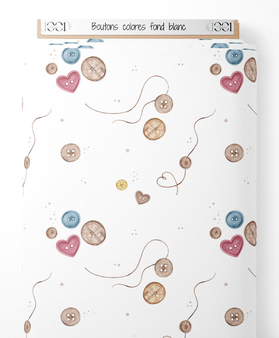 Les boutons sont de différentes tailles et formes, incluant des cœurs et des cercles. Les fils sont fins et sinueux, ajoutant un élément graphique au motif.Les tissus