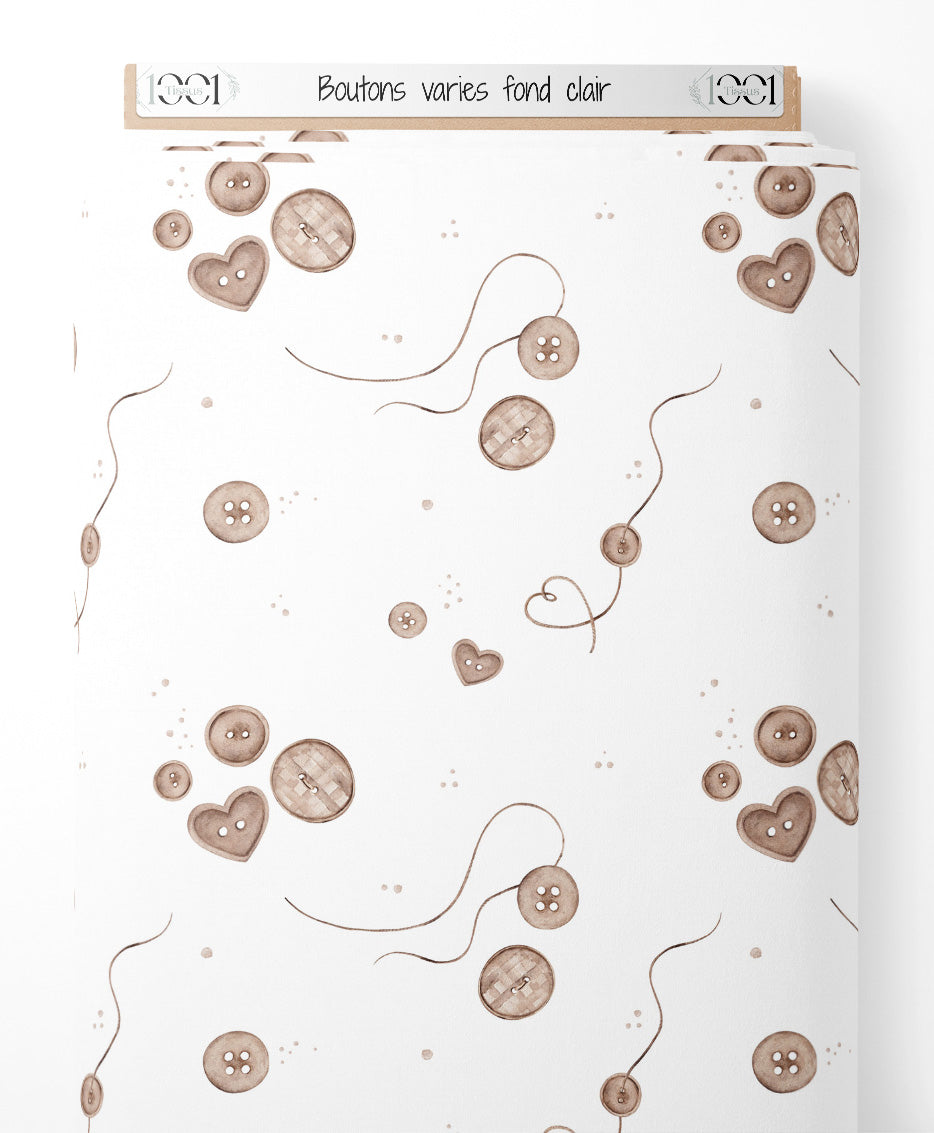 Les boutons varient en taille et en forme, incluant des cœurs. Les fils créent des courbes délicates sur le fond clair.Les tissus