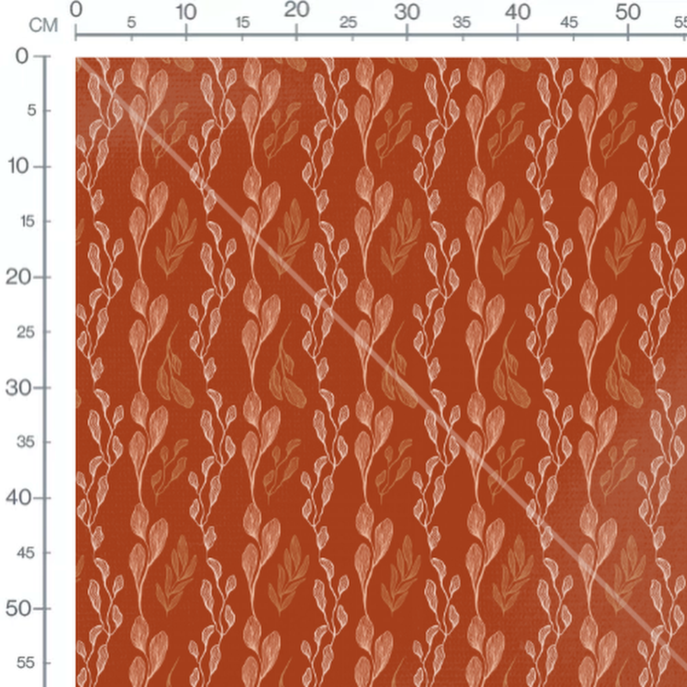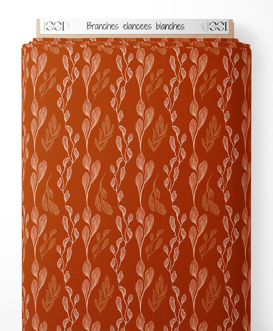 Les feuilles sont dessinées avec des lignes fines et délicates. Le fond rouille met en valeur les motifs clairs. Les branches sont disposées verticalement, créant un effet de hauteur.Les tissus