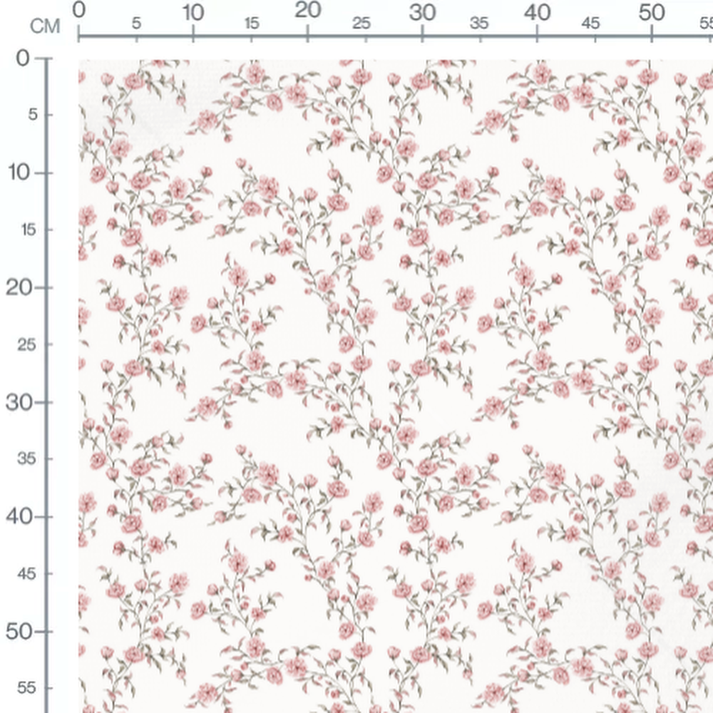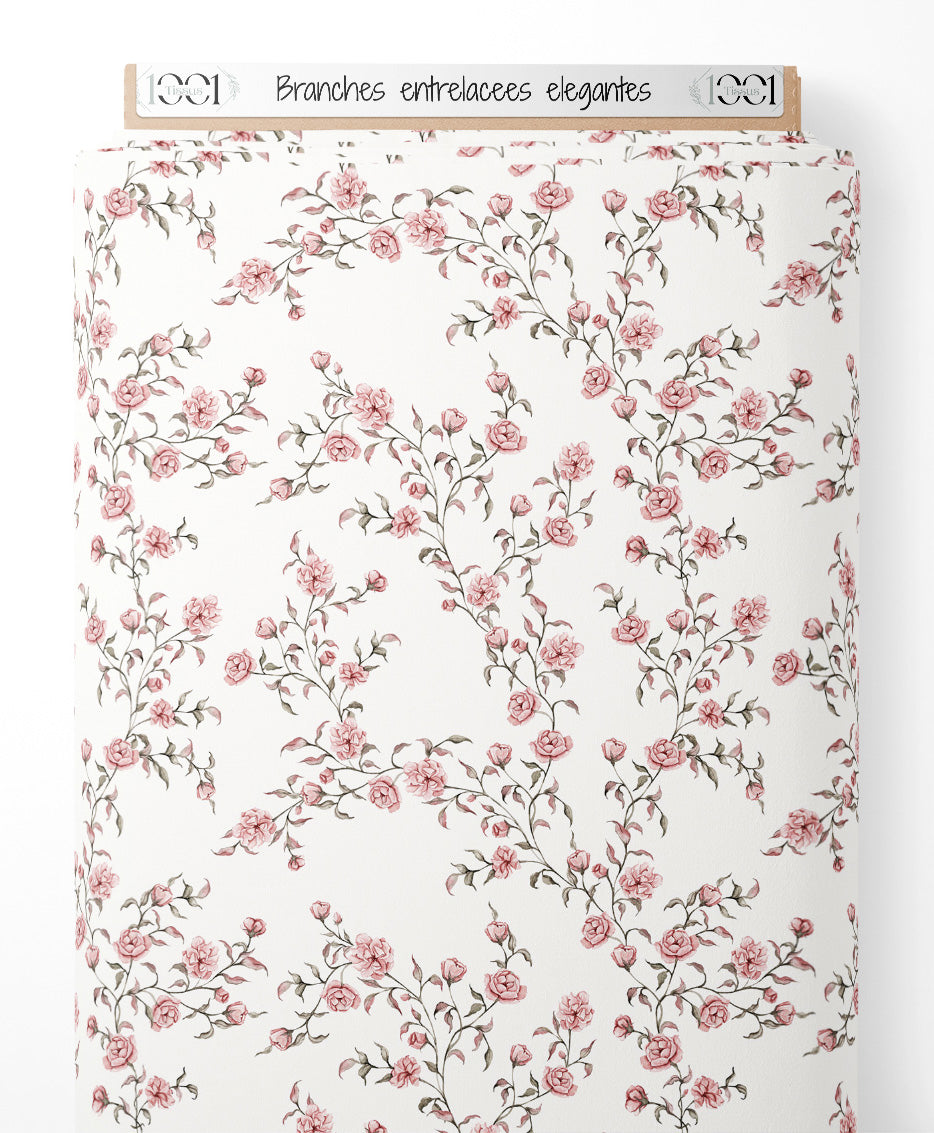 Les roses sont dessinées avec des détails fins et des nuances de rose. Les feuilles vertes ajoutent un contraste subtil. Les branches forment un motif harmonieux et élégant.Les tissus