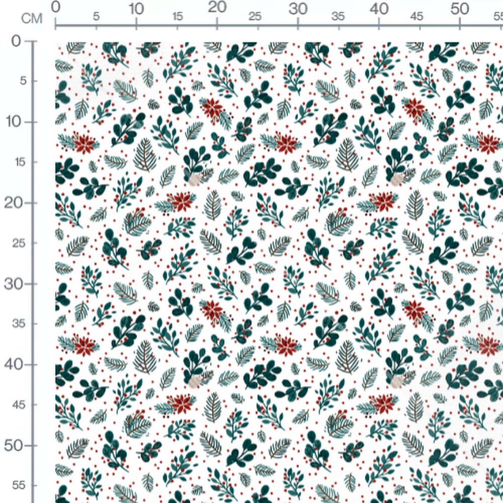 Les feuilles sont de différentes formes et tailles, avec des nuances de vert foncé. Les baies rouges ajoutent une touche de couleur vive au motif. Les fleurs rouges sont stylisées et se mêlent harmonieusement aux feuilles.Les tissus