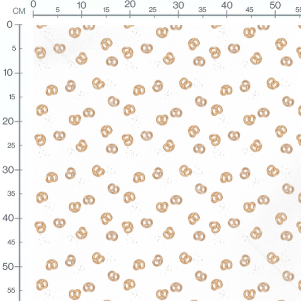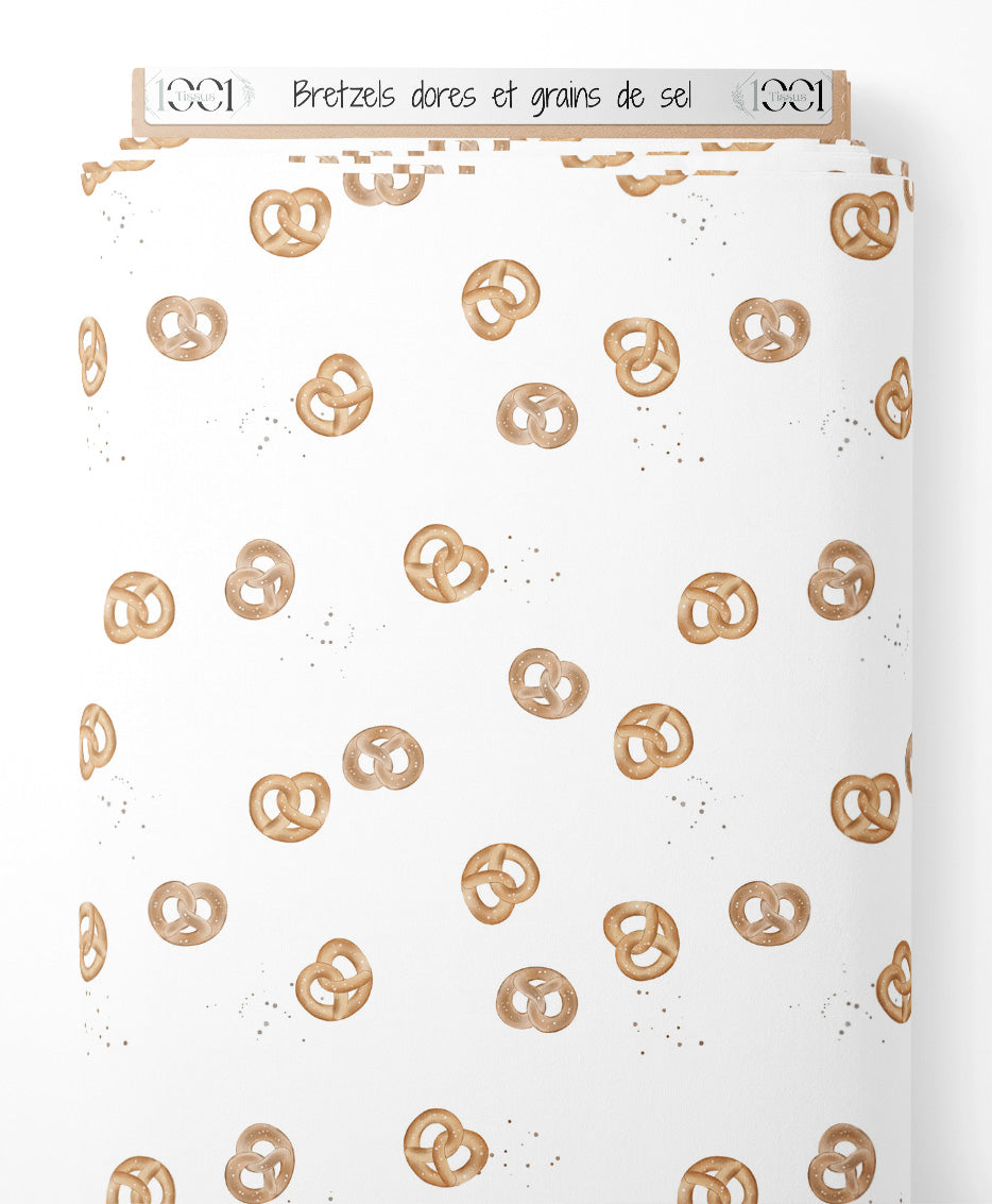 Bretzels dorés avec grains de sel sur fond blanc. Petites taches grises dispersées.Les tissus