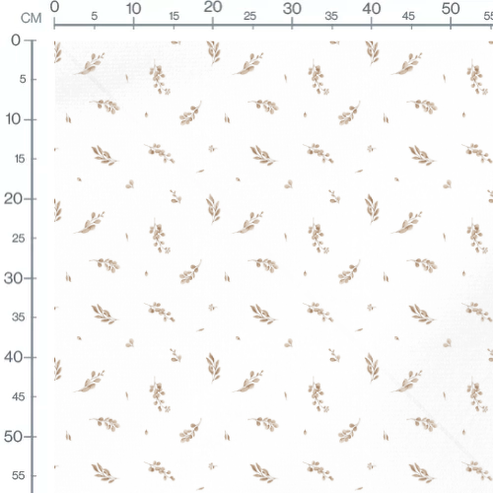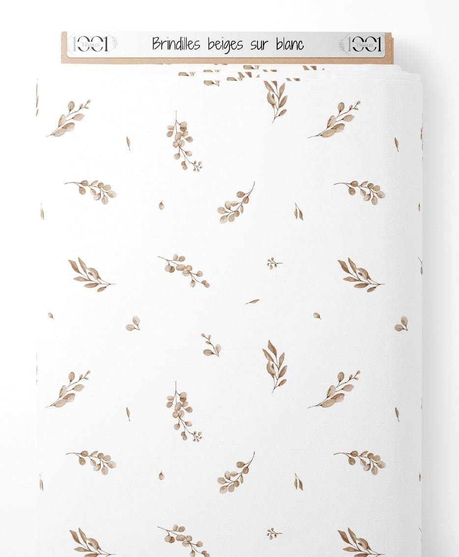 Les brindilles sont parsemées de petites feuilles aux teintes beiges. Le fond blanc met en valeur la simplicité du motif.Les tissus