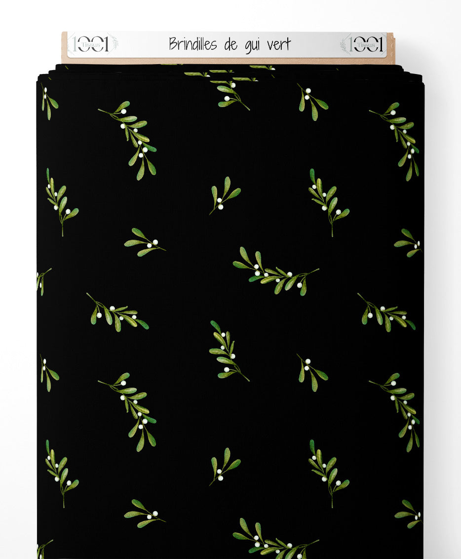 Les brindilles de gui sont de couleur verte avec des baies blanches. Les feuilles sont allongées et les baies sont petites et rondes. Le fond noir met en valeur les détails des brindilles.Les tissus