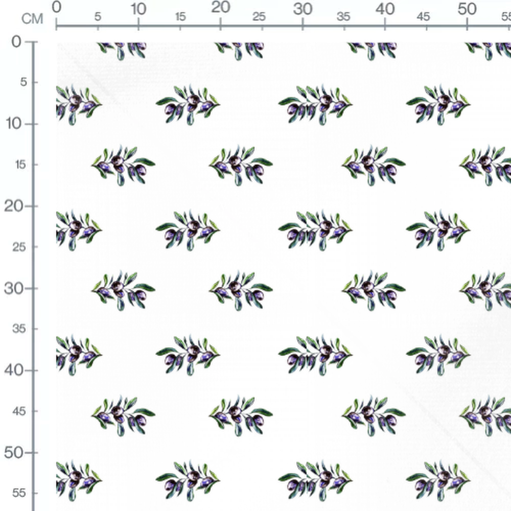 Les olives sont de couleur violette avec des nuances de vert. Les feuilles sont détaillées avec des teintes de vert foncé et clair.Les tissus