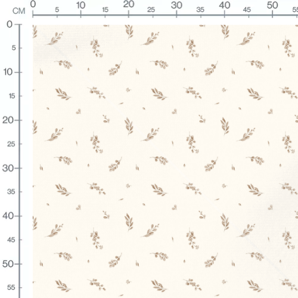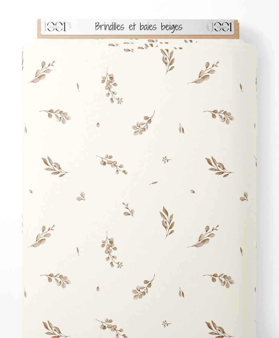 Les brindilles sont ornées de petites feuilles et de baies dans des tons beiges. Le fond crème met en valeur la délicatesse des motifs naturels. Les éléments sont espacés, créant une impression de légèreté et de simplicité.Les tissus