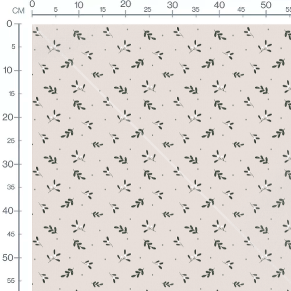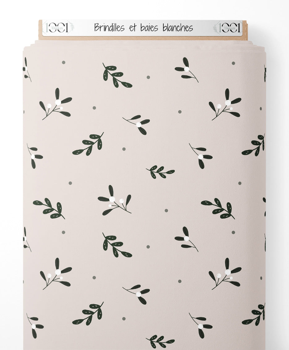 Les brindilles sont ornées de petites feuilles et de baies blanches. Le fond beige est parsemé de petits points gris, ajoutant une touche subtile au motif.Les tissus