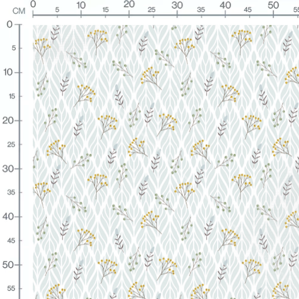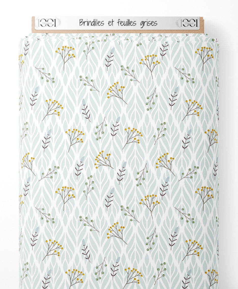Les brindilles sont ornées de petites fleurs jaunes vives. Le fond est composé de feuilles grises entrelacées, créant un effet apaisant.Les tissus