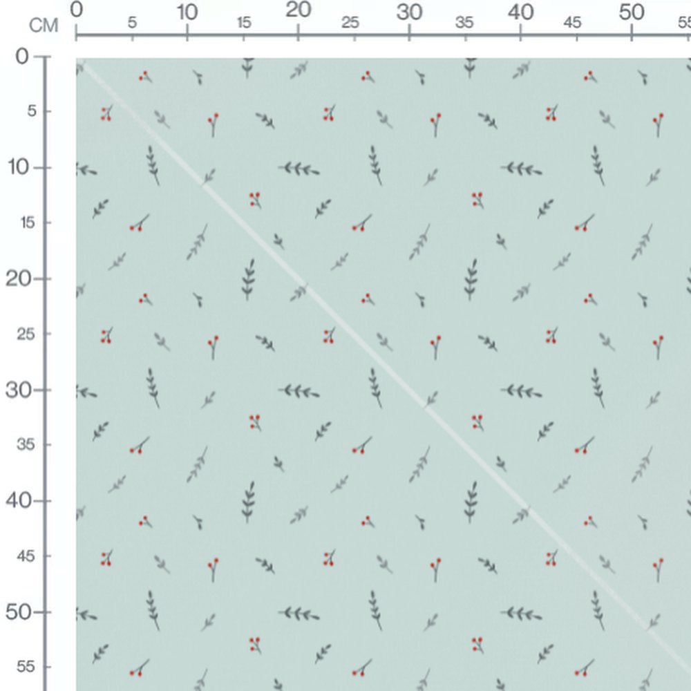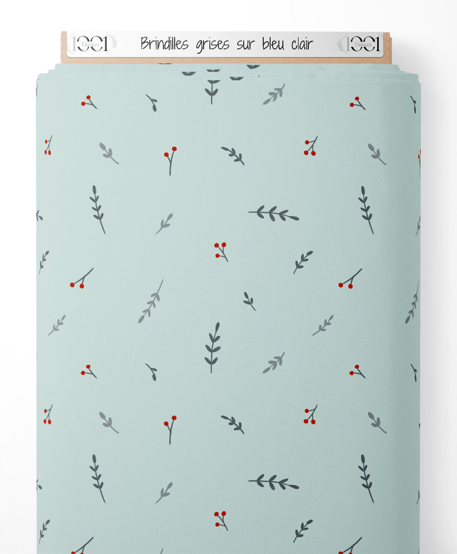 Les brindilles sont fines et de couleur grise. Les baies rouges ajoutent une touche de couleur vive. Le fond bleu clair crée une ambiance douce et apaisante.Les tissus