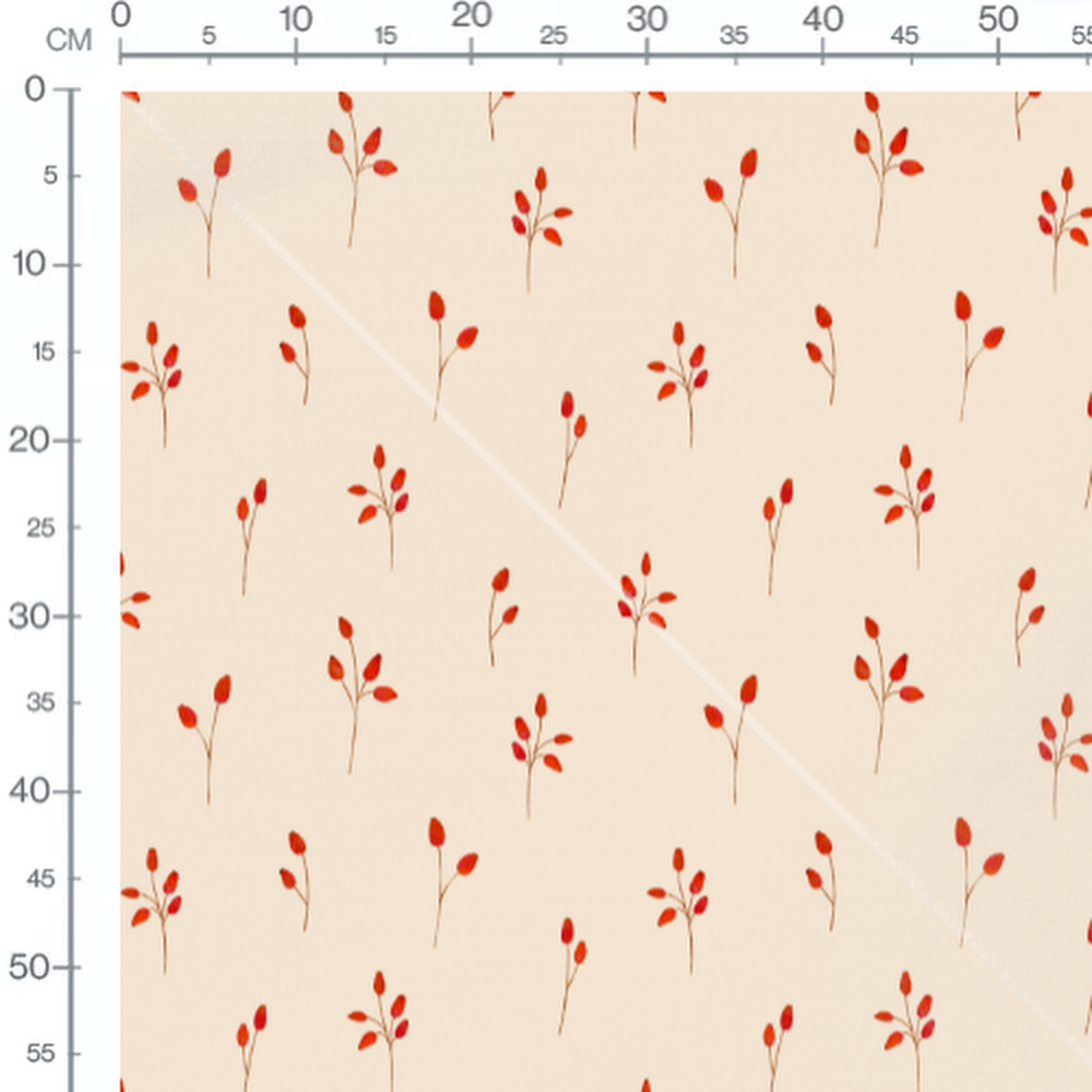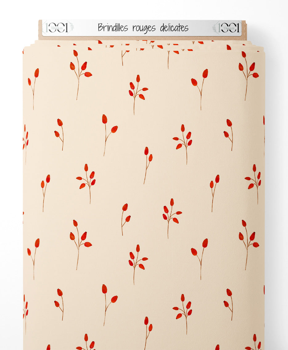 Les brindilles sont dispersées uniformément sur le fond beige. Chaque brindille comporte plusieurs petites feuilles rouges. Les tiges sont fines et délicates, ajoutant une touche naturelle au motif.Les tissus