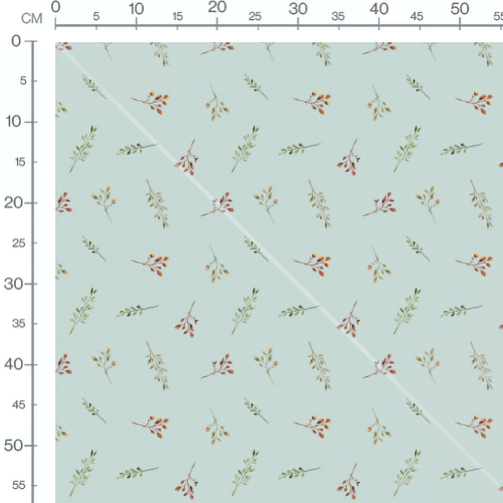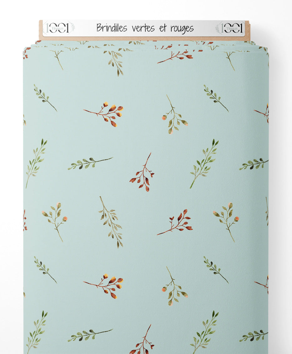 Les brindilles sont délicatement peintes avec des nuances de vert et de rouge. Les feuilles varient en taille et en forme, ajoutant une touche organique. Les baies rouges apportent une note de couleur vive. Le fond bleu clair crée une ambiance douce et apaisante.Les tissus