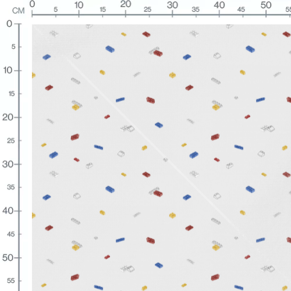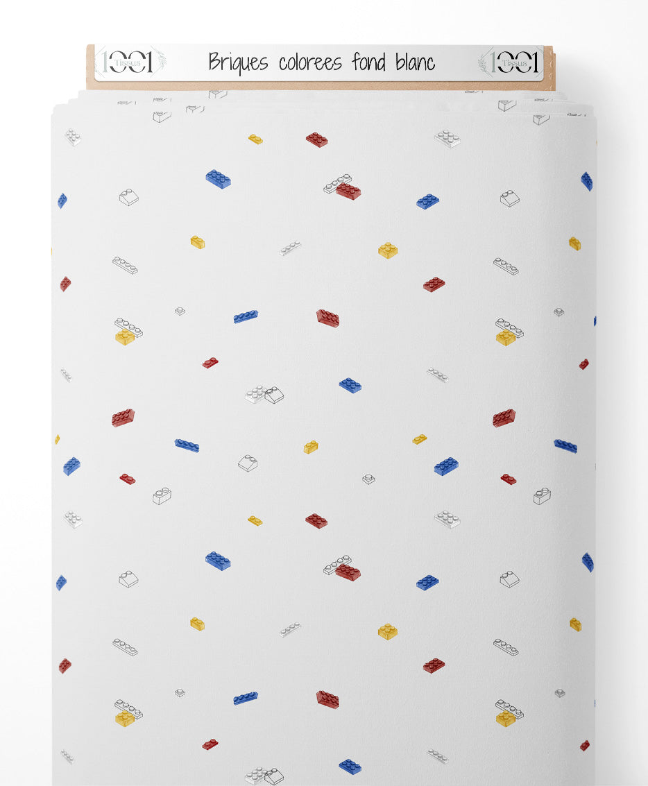 Les briques rouges, bleues et jaunes sont réparties sur un fond blanc. Des dessins de briques en noir ajoutent un effet de contraste. Les couleurs vives des briques se détachent sur le fond clair.Les tissus