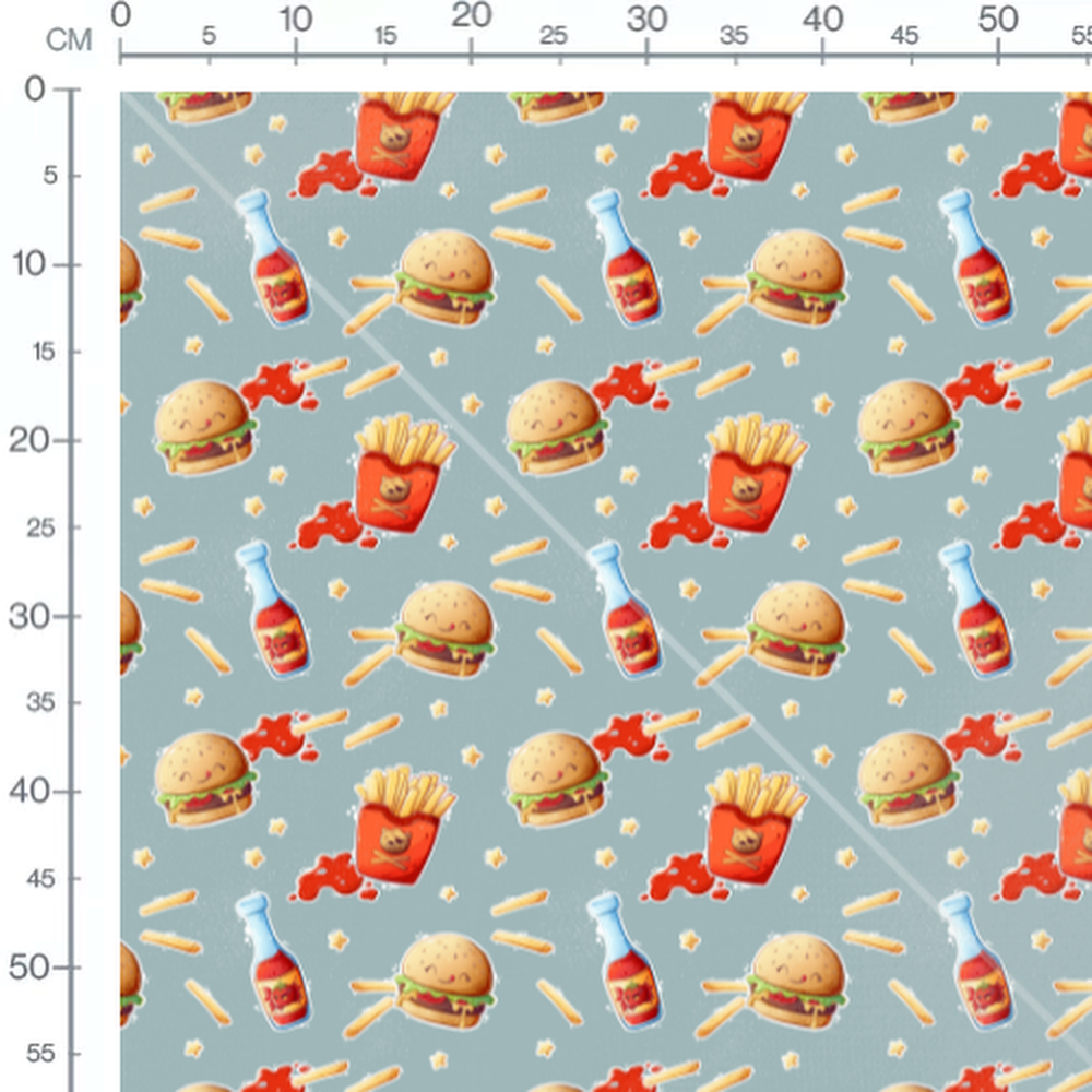 Les burgers ont des visages souriants et sont accompagnés de frites dorées. Des éclaboussures de ketchup rouge ajoutent une touche de couleur vive. Des étoiles jaunes et des bouteilles de ketchup complètent le motif ludique.Les tissus