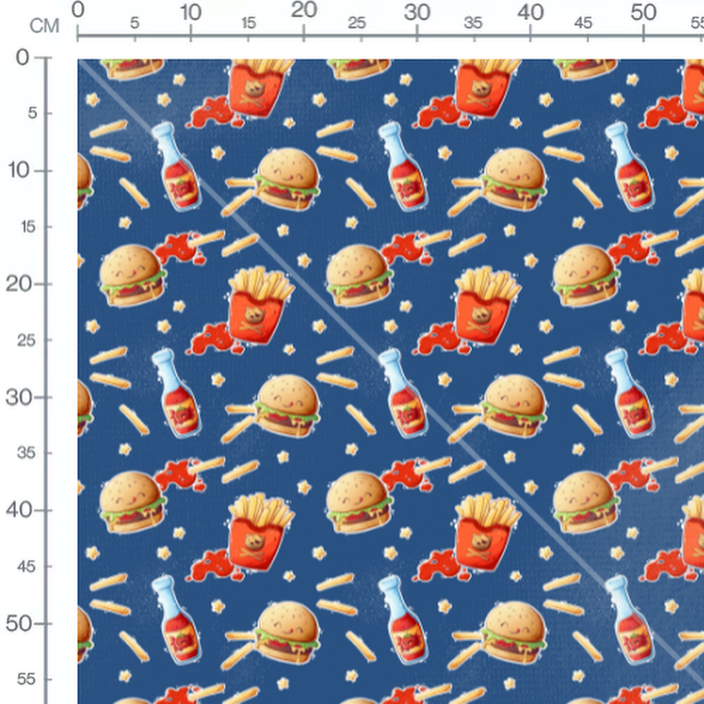 Les burgers sont ornés de visages souriants et entourés de frites dorées. Des éclaboussures de ketchup rouge ajoutent une touche ludique. Des étoiles jaunes complètent le motif joyeux.Les tissus