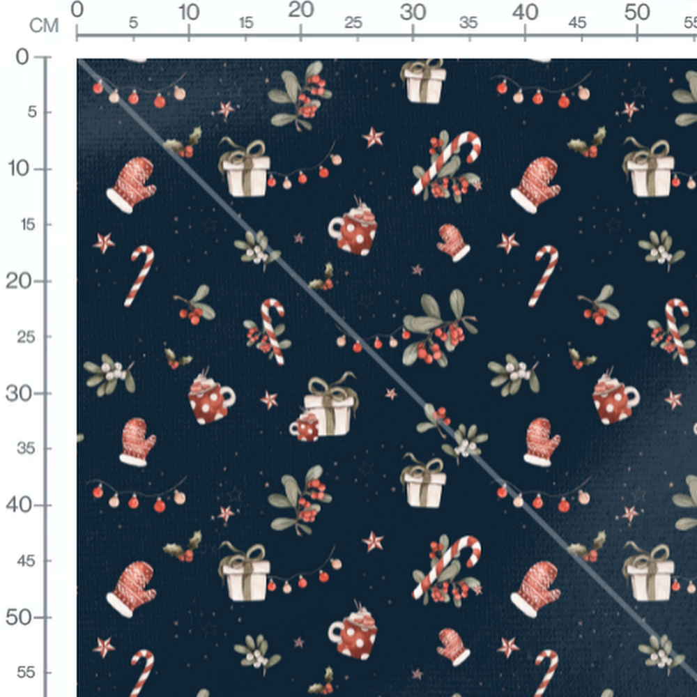 Les cadeaux sont ornés de rubans verts. Les bonbons en forme de canne sont rayés rouge et blanc. Les tasses rouges ont des pois blancs. Les branches de houx sont agrémentées de baies rouges.Les tissus