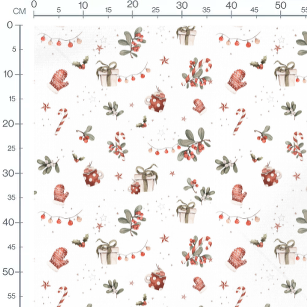 Moufles rouges à motifs et étoiles dispersées. Branches de gui et cannes à sucre rayées. Petites baies rouges et décorations festives.Les tissus