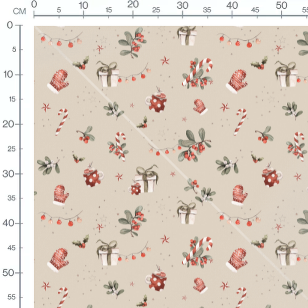Gants rouges à motifs blancs et guirlandes lumineuses. Feuilles vertes et baies rouges ajoutent une touche festive. Petites étoiles grises complètent le design.Les tissus