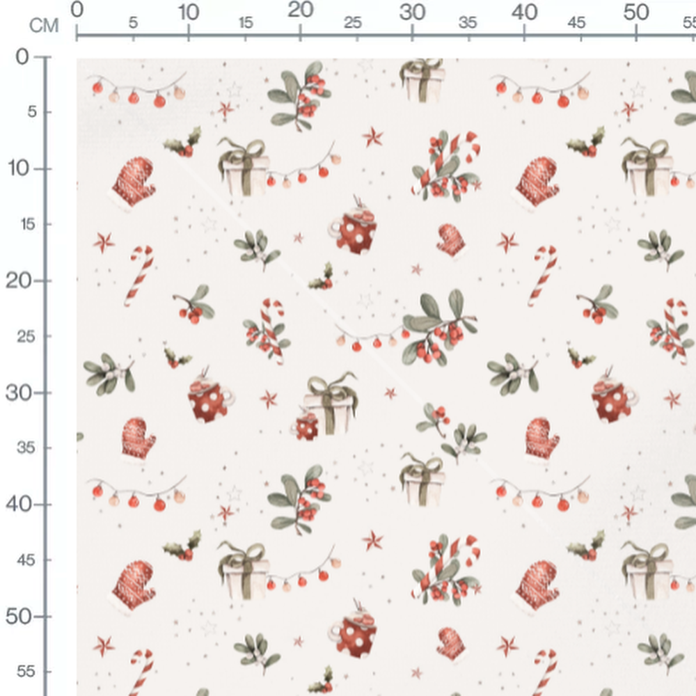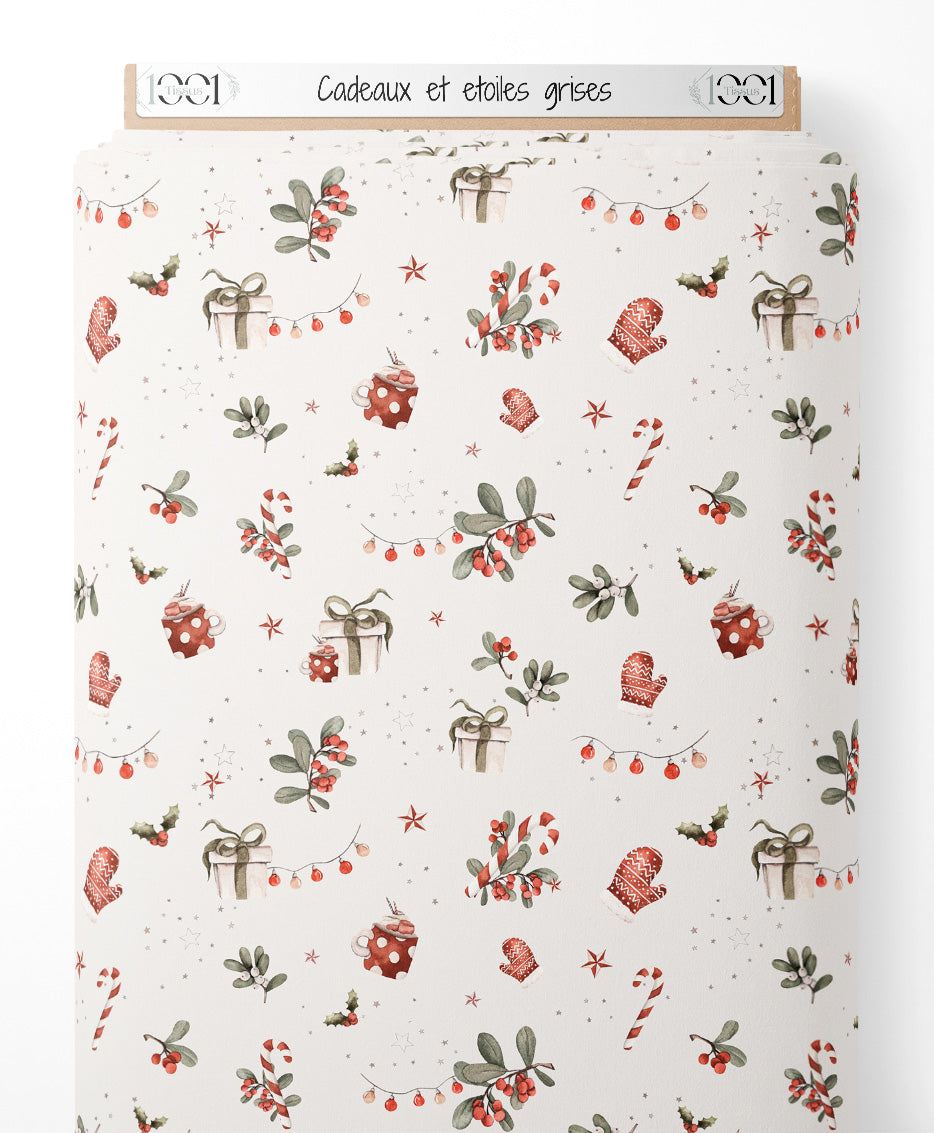 Sucreries en forme de canne et étoiles grises dispersées. Feuilles de houx vertes avec baies rouges. Petites étoiles grises ajoutent une touche subtile.Les tissus