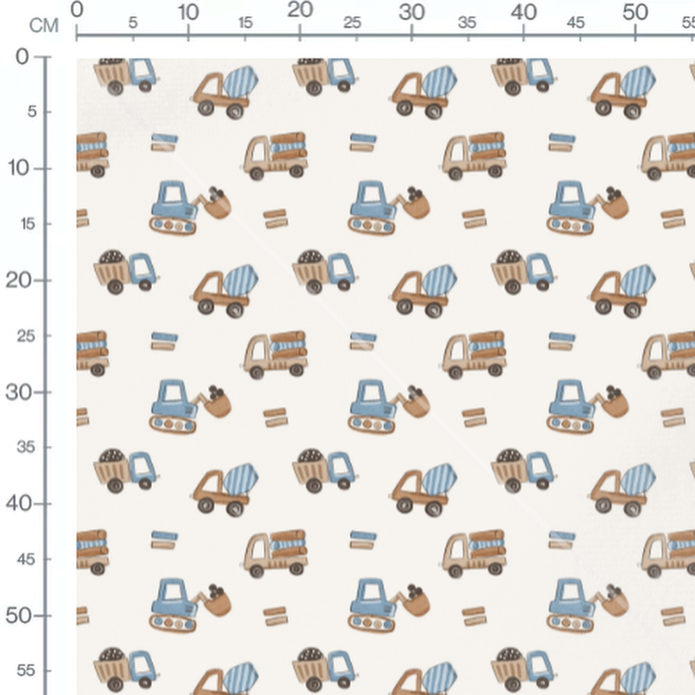 Les camions transportent des matériaux variés. Les pelleteuses sont illustrées avec des godets remplis. Les véhicules sont dessinés dans un style enfantin. Les couleurs principales incluent le bleu, le marron et le noir.Les tissus