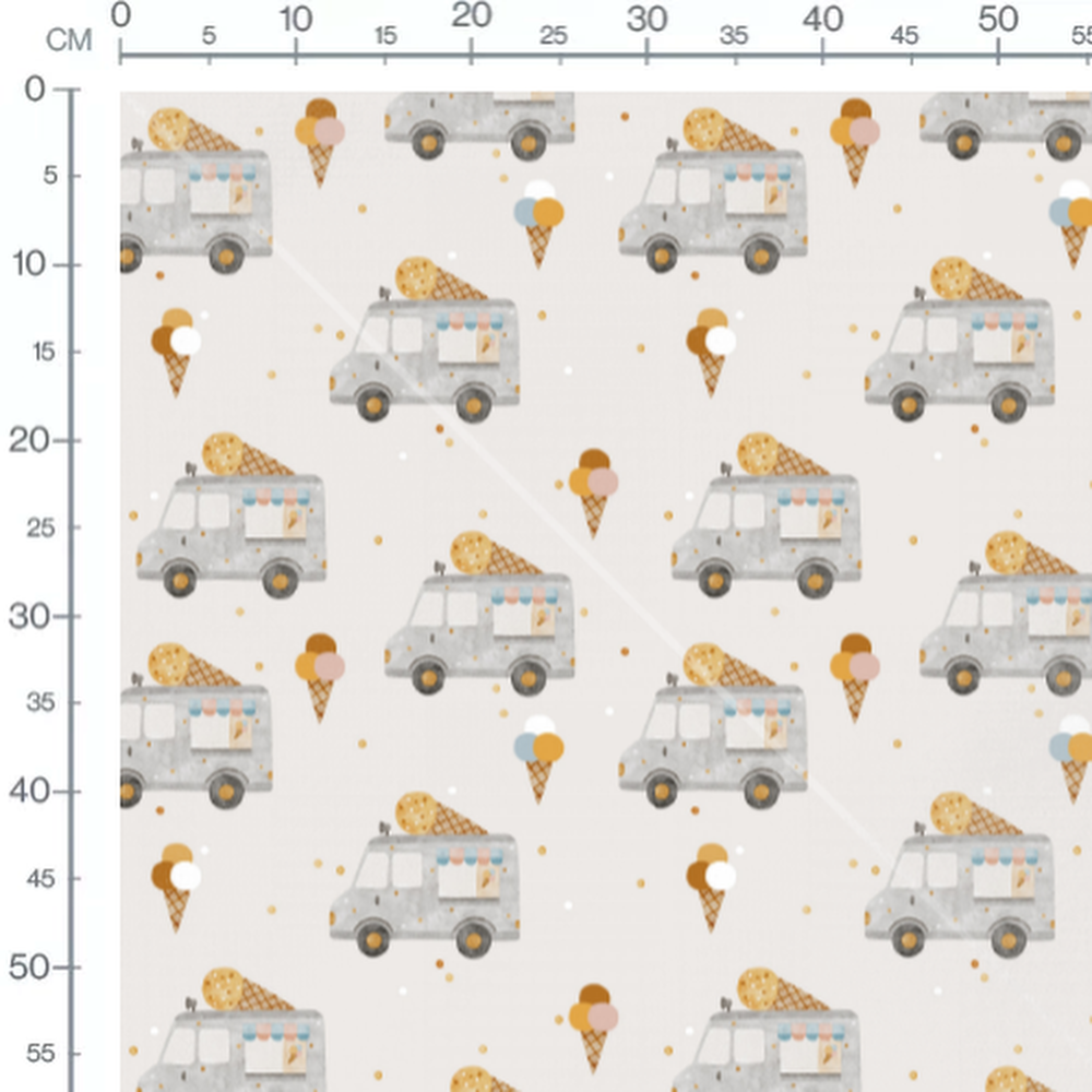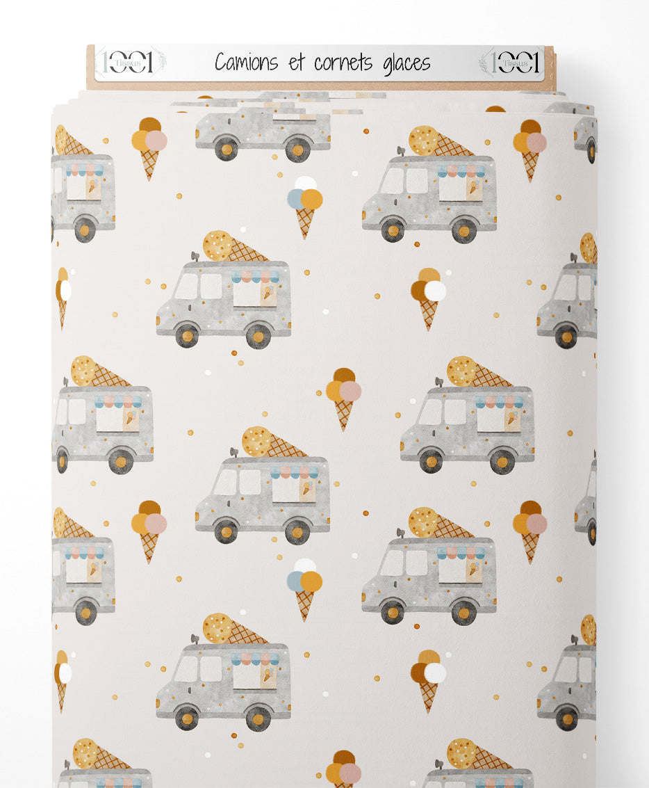 Les camions de glace sont décorés de petits drapeaux pastel. Les cornets de glace sont en trois couleurs : marron, beige et blanc. Les points colorés ajoutent une touche ludique au motif.Les tissus