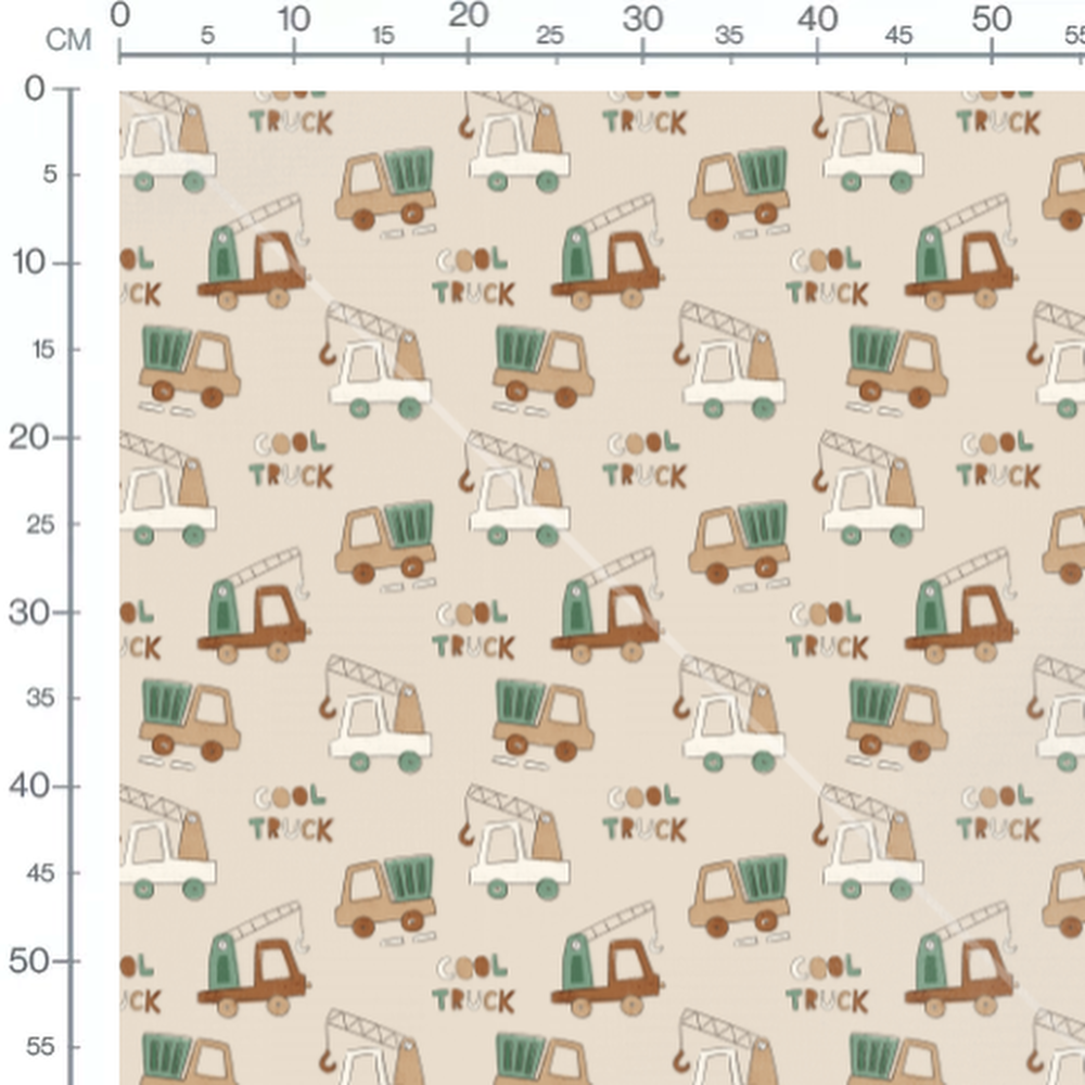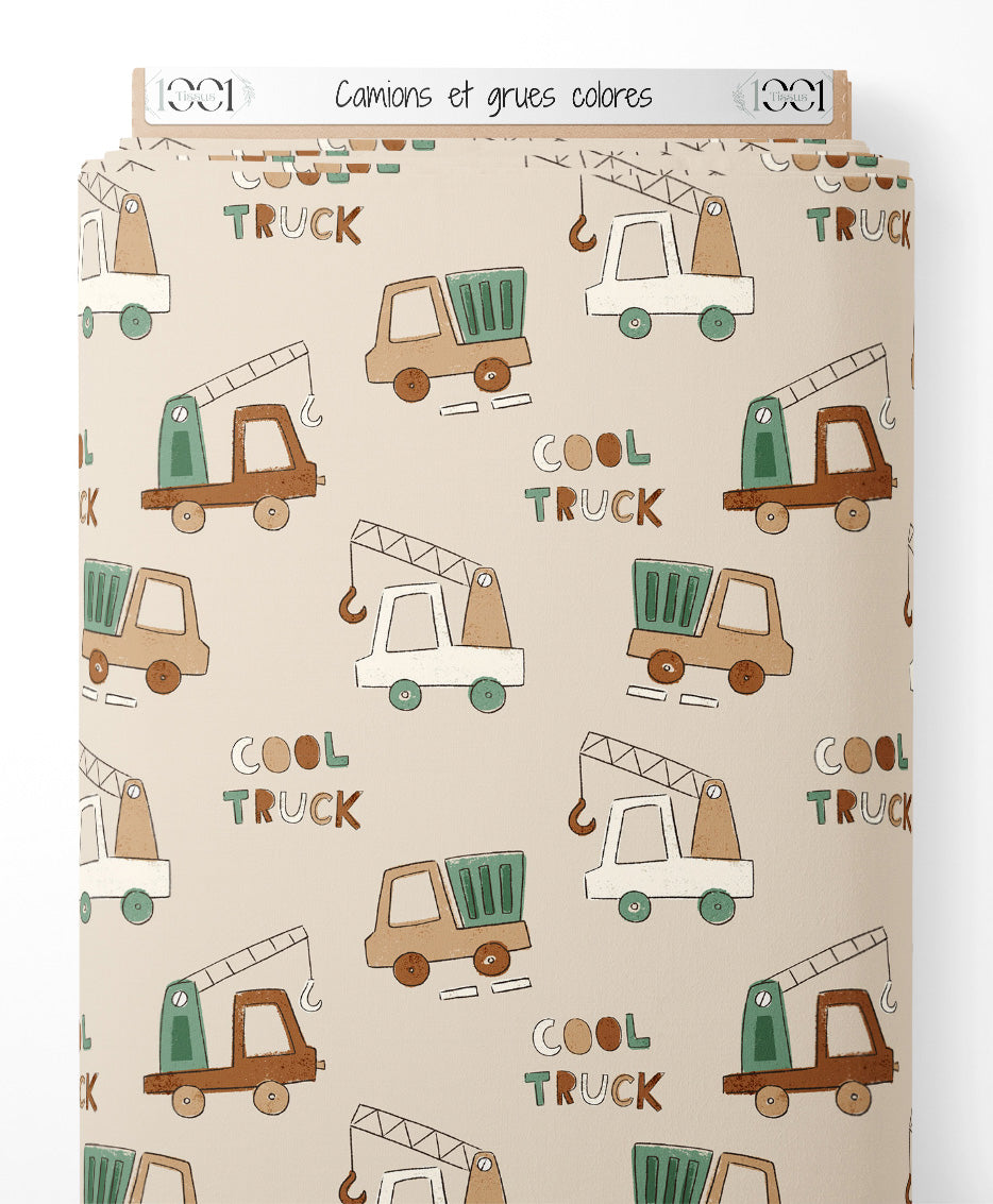 Les camions sont dessinés avec des détails simplifiés et des couleurs douces. Les grues sont équipées de crochets et sont accompagnées de lettres multicolores. Le fond beige met en valeur les illustrations des véhicules.Les tissus